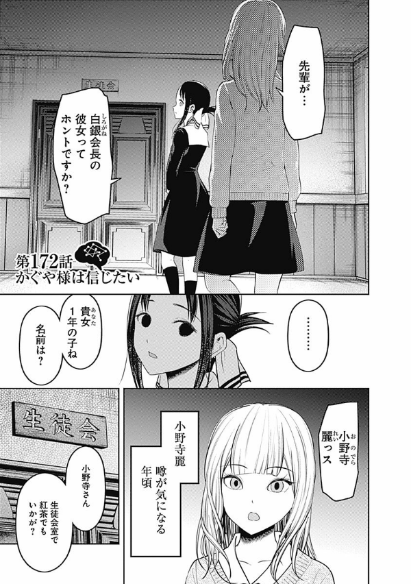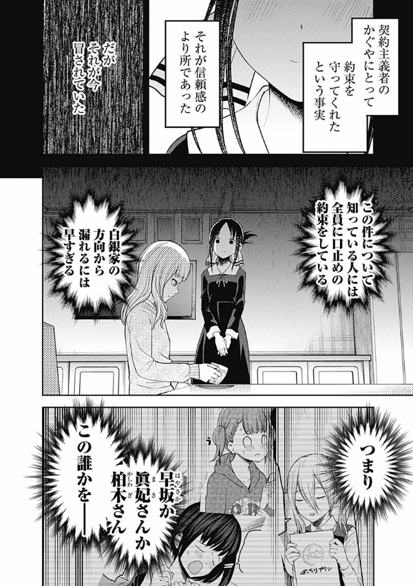 「恋愛は告白した方が負けなのである!」 エリートの集う秀知院学園生徒会で出会った会長・白銀御行と副会長・四宮かぐや…。この両想いであるはずの天才2人が、互いに相手に惚れさせ、相手から告白させようと日常の全てで権謀術数の限りを尽くす、新感覚のラブコメ!! …として始まった本作も、第18巻まで積み重ね、2人は付き合い始め、3学期を迎えた!! その事実は、絶対に誰にもバレてはいけないのだが、かぐやはラブ度が高めの日は生徒会室でもいちゃつきたいと思うほど完全にアホになってしまった!? そして2年生は、修学旅行で京都へ!! しかし、かぐやは旅先で白銀といちゃつく間もなく…専属近侍・早坂愛との絆が試される“修学旅行編”開幕!!