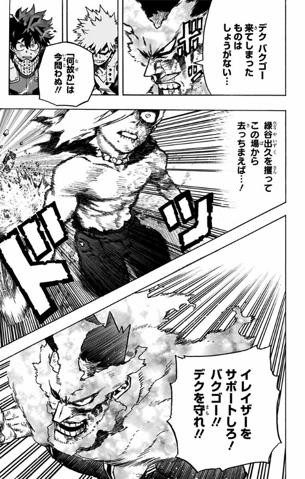 デッカい男のせいで、辺り一帯がメチャクチャ! 「主のもとへ」って、死柄木? ……ダメ! こいつが街に降りたら、ひとたまりもない! 雄英生も危険じゃない! 蛇腔病院側で何が!? い・い・か・ら、止まれぇぇええええ!! “Plus Ultra”!!