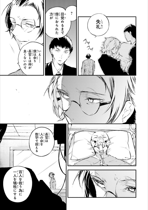 手掛かりを「神の目」で見つけるため、敦は嘗ての敵・フィッツジェラルドを訪れる。一方、マフィアに身を寄せる与謝野は、森にマフィアへの移籍を打診される。与謝野と森の過去には一体何が…風雲急を告げる16巻!