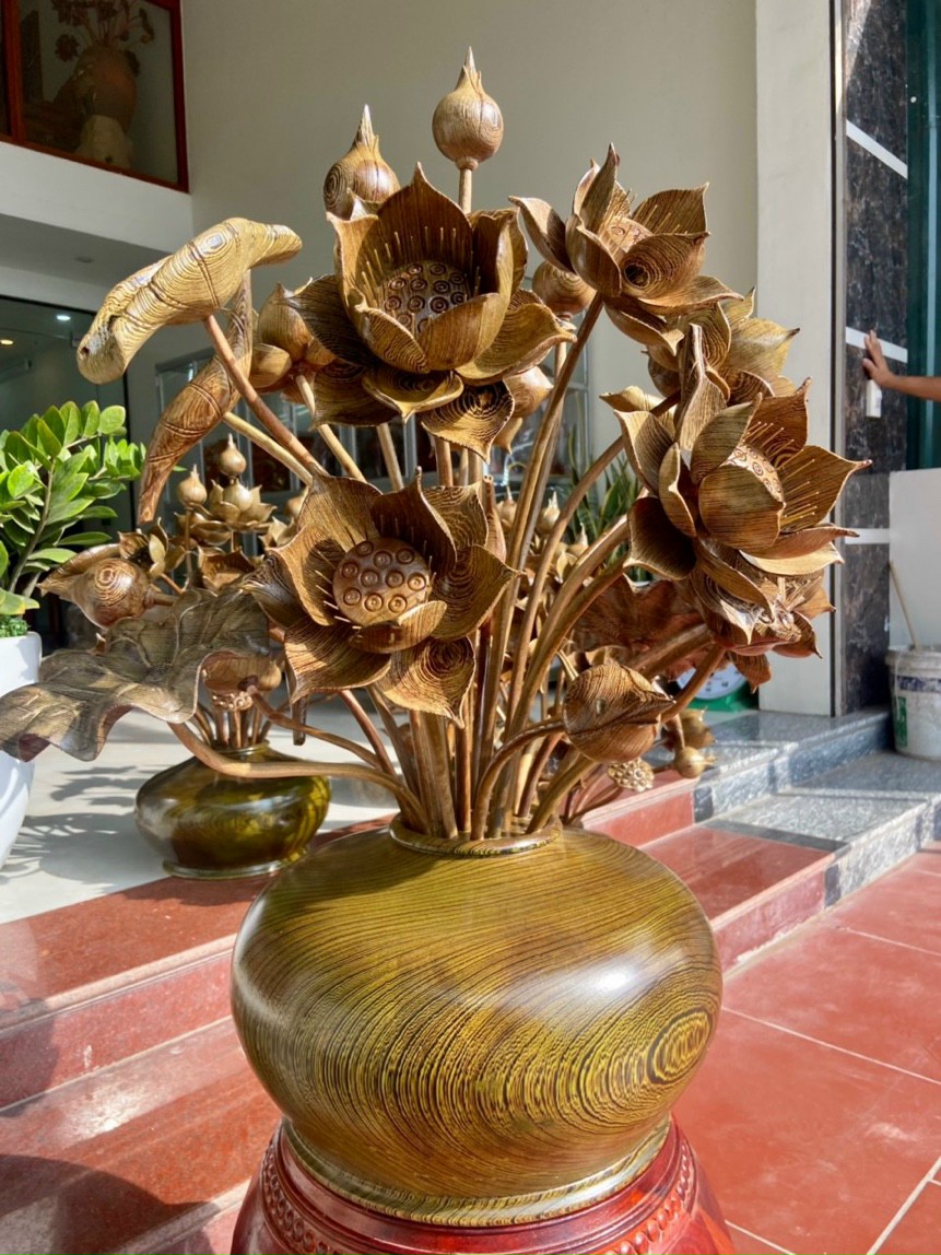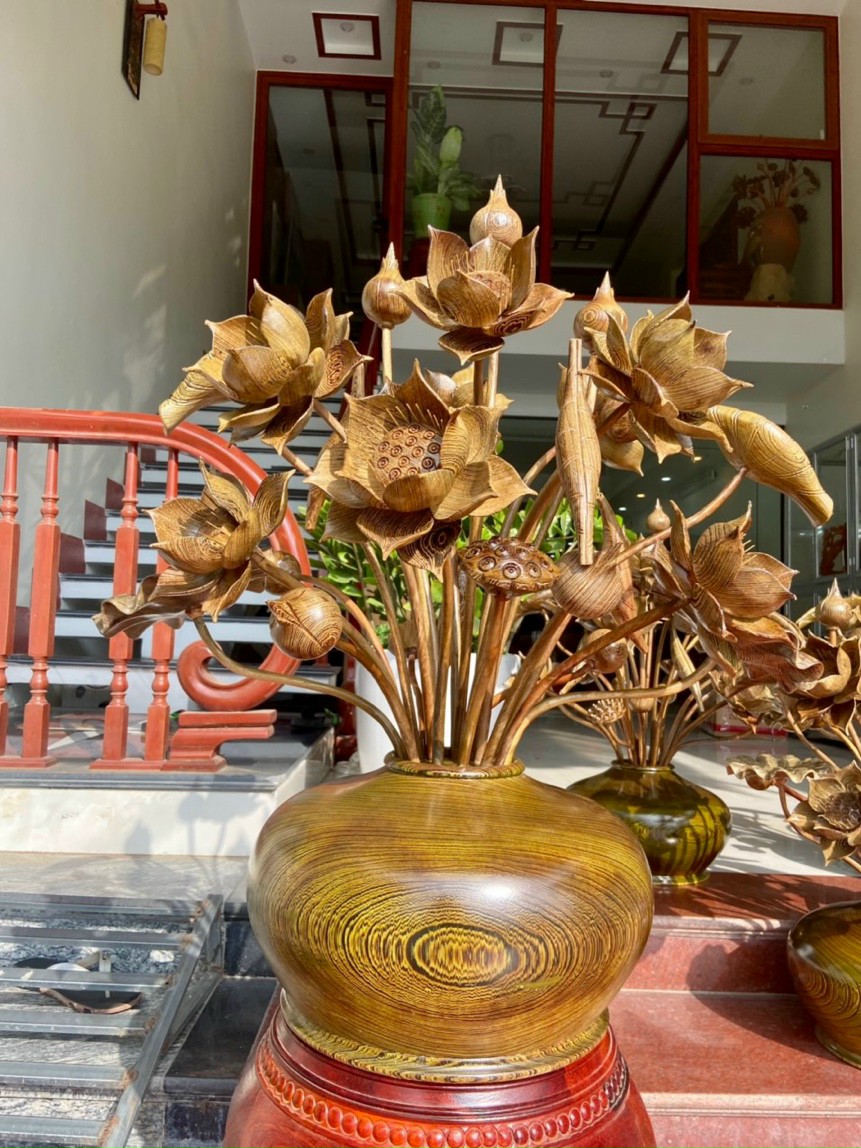 Bình hoa sen trang trí phòng thờ phòng khách ,phòng khách được làm bằng chất liệu gỗ mun đuôi công tự nhiên 100%  kt bình cắm hoa 23×37cm + kt 25 hoa lá cành gương cao tổng 85×70cm _ Bình hoa sen được tiện khắc thiết kế dáng bình phân khúc từ chân tới đầu vô cùng mềm mại và đẹp ,Kết hợp với sự sắp sếp hoa lá cành được làm hoàn toàn bằng tay thủ công ,được chỉnh sửa gọt sắc li ti tinh mỉ tinh sảo với độ trắc chắn chính xác cao .Đồng thời bình hoa sen được kiểm định kỹ lưỡng khắt khe ,như cho vào thẩm sấy cho gỗ khô kiệt .Mục đích trống dập nứt vênh mo mối mọt ,Kết hợp với trà nhám ,đánh giấy giáp nhiều lần ,sờ mát lạnh .Song rồi cho vào phun lót làm bóng mờ để giữ lại mầu sắc vân gỗ tự nhiên .Bình hoa sen được làm và hoàn thiện do bàn tay khối óc tài hoa .Từ những người thợ giàu kinh nghiệm ,Cũng như tay nghề cao trong làng nghề truyền thống .Chính vì thế bình hoa sen đã đáp ứng đầy đủ tất cả mọi tiêu trí ( Đẹp bền rẻ ) Thẩm mỹ nghệ thuật với chất lượng tuyệt vời