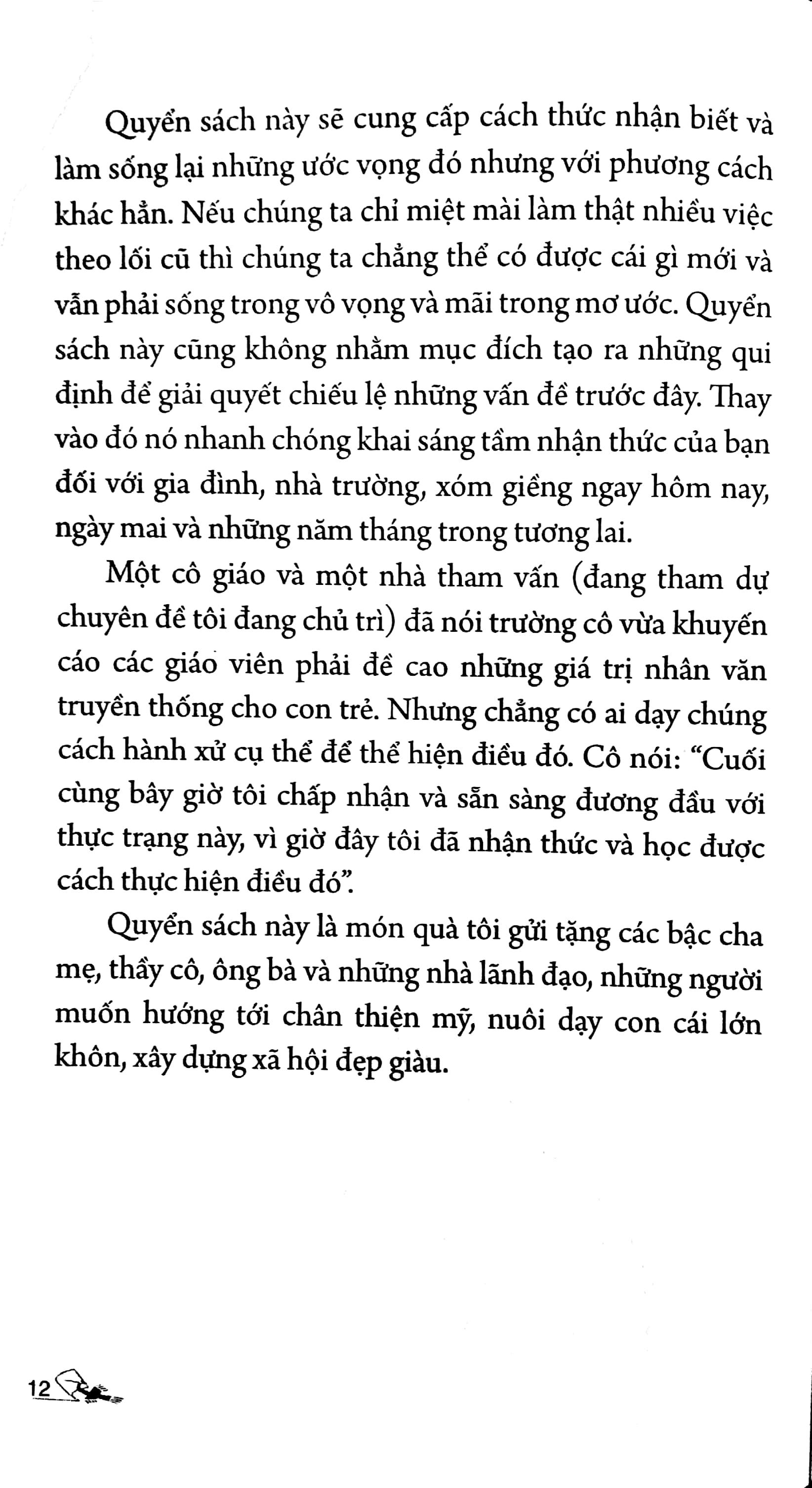 Tác giả đưa ra những phương cách đã được kiểm chứng, phổ cập, mang tính khả thi với mục đích nuôi dưỡng những giá trị nhân văn cốt lõi cho thế hệ chúng ta và con cháu. Nội dung sách sẽ mở ra cho bạn một tầm nhận thức mới nhưng rất thiết thân với gia đình, nhà trường, láng giềng hôm nay, ngày mai và những năm tháng trong tương lai. Tất cả ý nguyện và tâm niệm của tác giả được gói gọn trong sách 10 món quà vô giá đầy ý nghĩa đang chờ bạn sớm dành tặng cho con cái mình với tất cả tin yêu và hạnh phúc.