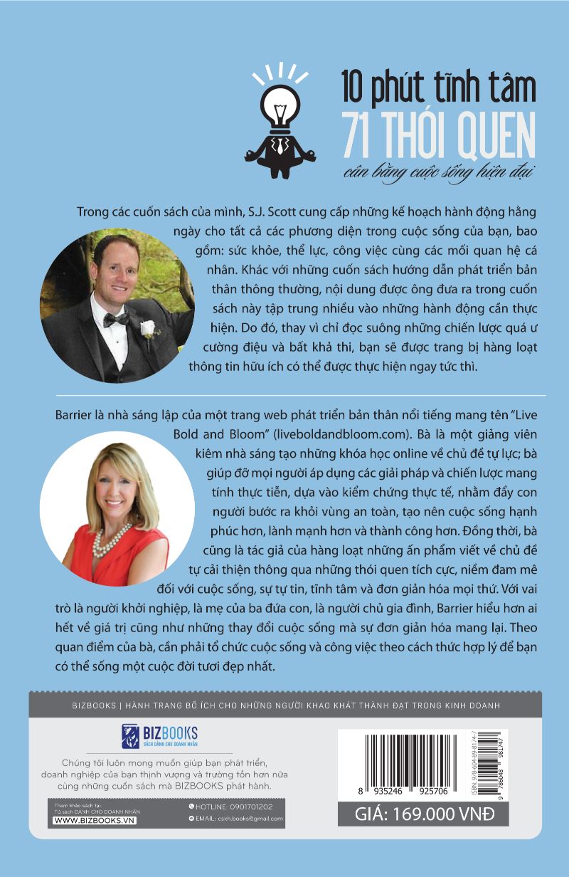 Steve Scott là tác giả của những cuốn sách về phát triển bản thân bán chạy nhất, tập trung vào xây dựng các thói quen, trong đó có cuốn sách “Habit Stacking: 97 small life changes that take 5 minutes or less”. Còn Barrie Davenport là một chuyên gia về phát triển bản thân. Bà là người truyền cảm hứng, giúp người khác tìm thấy đam mê của họ, tạo ra một cuộc sống đầy đủ hơn, hạnh phúc hơn và có mục đích rõ ràng hơn. Barrie đã có hơn 20 năm làm chuyên gia về quan hệ công chúng rất thành công, giúp khách hàng của mình nhận ra đam mê của họ. Bà từng là giám đốc tiếp thị và PR cho nhiều trường đại học, hỗ trợ sinh viên theo đuổi đam mê nghề nghiệp của riêng họ.