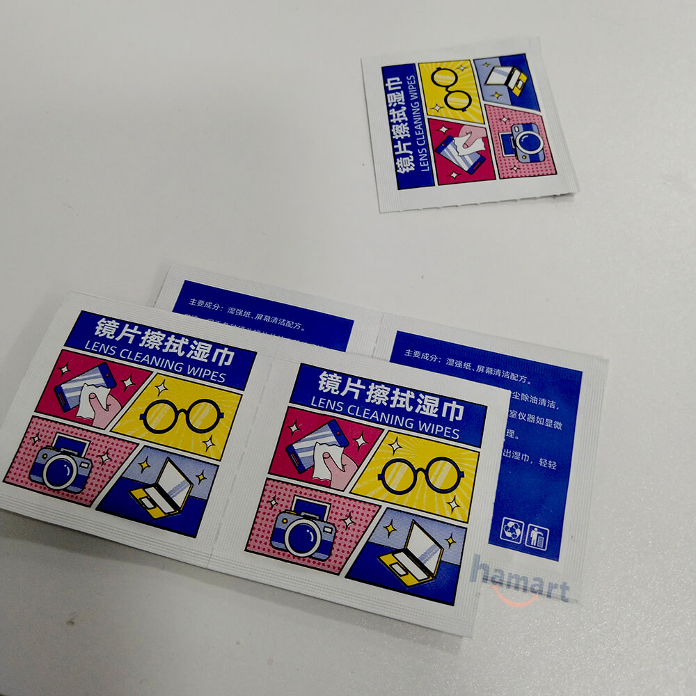 Tên sản phẩm: Khăn lau ống kính  Kích thước sản phẩm: 6 * 12cm Quy cách đóng gói: 100 cái / hộp Nguyên liệu chính: giấy bột gỗ cường độ ướt, chất hoạt động bề