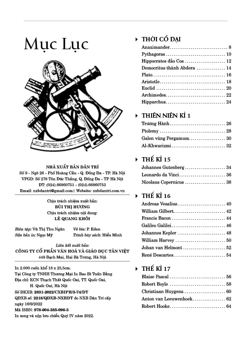 Mua tại TiktokCuộc sống hiện đại ngày nay được lấp đầy bởi vô vàn sản phẩm của trí tuệ và khoa học. Chính những sản phẩm ấy cùng các phương pháp khoa học đã tạo nên cuộc cách mạng làm thay đổi cả thế giới. Tuy nhiên, để làm được điều đó phải kể đến những nhà khoa học xuất sắc, những người đã cống hiến không ngừng cho sự phát triển của nhân loại. Nhằm giúp mọi người có thêm hiểu biết về những con người vĩ đại này, tác giả Jon Balchin đã cho ra đời cuốn sách 100 nhà khoa học vĩ đại thay đổi thế giới. Trong cuốn sách này, Jon Balchin đã giới thiệu một cách ngắn gọn nhưng đầy đủ, dễ nhớ về tiểu sử cùng những thành tựu tiêu biểu nhất của 100 “người khổng lồ” có tầm ảnh hưởng trên thế giới. Với những nỗ lực không ngừng nghỉ trong lĩnh vực khoa học (từ vũ trụ học của Copernicus và Galileo đến nhiều cuộc cách mạng thời Trung Cổ của Hippocrates và Galen, hay câu chuyện của anh em nhà Wright, nhà nữ khoa học – người tiên phong chất phóng xạ Marie Curie và thiên tài Vật lý Albert Einstein, Stephen Hawking…), tác giả đã khai thác rất nhiều lĩnh vực quan trọng trong cuộc sống như vật lý, sinh học, hóa học và gen. Mỗi lĩnh vực gồm nhiều phát hiện thú vị, chẳng hạn như khám phá về hình học (Euclid), máy in (Gutenberg), kính viễn vọng (Galileo), thuốc nổ (Alfred Nobel), điện thoại (Alexander Graham Bell), phân tâm học (Freud), radium (Marie Curie) và penicillin (Alexander Fleming)… Mỗi nhà khoa học trong cuốn sách được giới thiệu thông qua 3 ý chính: Mốc sự kiện/Ghi chú về ngày tháng: Tóm tắt những dấu mốc quan trọng trong cuộc đời nghiên cứu của mỗi nhà khoa học/cặp đôi nhà khoa học. Nội dung:giới thiệu qua về tiểu sử/câu chuyện cá nhân, quá trình khám phá, tầm quan trọng trong những khám phá tiêu biểu nhất của họ và nêu lên tầm ảnh hưởng của những khám phá đó đối với thế giới. Di sản/Ảnh hưởng:cung cấp thêm những thông tin bổ sung về nhà khoa học được nhắc đến. Đan xen giữa các thông tin trên là những câu chuyện đầy thú vị và gây tò mò về sự đột phá khoa học. Thông qua đó, bạn đọc có thể thấy rằng những nhà khoa học dù phải chịu sự hoài nghi và những chỉ trích đầy khắc nghiệt, nhưng vẫn vươn lên và thành công, xóa mờ các đường biên giới giới hạn kho tri thức của nhân loại. Với bố cục được trình bày theo trình tự thời gian, hình ảnh sinh động và nội dung dễ hiểu, 100 nhà khoa học vĩ đại thay đổi thế giới là cuốn sách vừa để giải trí, vừa cung cấp những thông tin vô cùng thiết thực cho độc giả trong độ tuổi 10+. Có thể nói, cuốn sách là câu chuyện về những sáng kiến đã định hình thế giới ngày nay và những ý tưởng sẽ định hình tương lai của toàn nhân loại sau này.