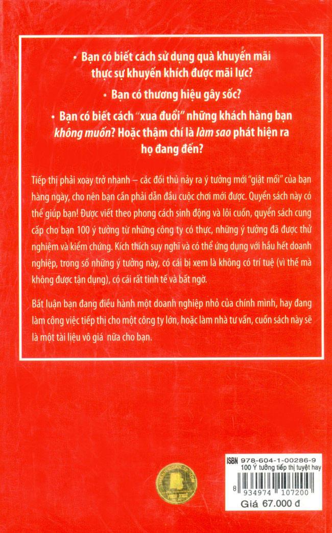 Tiếp thị là biết sáng tạo, sáng tạo để biến bản thân thành người thắng cuộc “fair-play”: thỏa mãn khách hàng để thu được lợi nhuận (chứ không phải lừa bịp họ cốt để bán được thứ mình có); đấu thủ cạnh tranh sòng phẳng (chứ không giở thủ đoạn giành giật khách hàng một cách thô bạo để rồi rốt cuộc cũng không giữ được họ). Và mã thượng hơn cả là trở thành những đối tác liên thủ năng lực phục vụ khép kín khách hàng (chứ không phải là “liên minh ma quỉ” độc quyền lủng đoạn!). Ở đây không có ý tưởng nào chỉ cho bạn cách để có một quảng cáo bắt mắt hơn nữa, một chiêu khuyến mãi lôi kéo người ta đổ xô đến với bạn trong ngắn hạn rồi “tháo chạy” qua người có khuyến mãi khác! Chính xác là 100 ý tưởng tiếp thị tuyệt hay chỉ cho bạn thấy được hố sâu rủi ro của những ai không biết chơi đẹp, không biết chơi khôn ngoan tỉnh táo trên thị trường.
