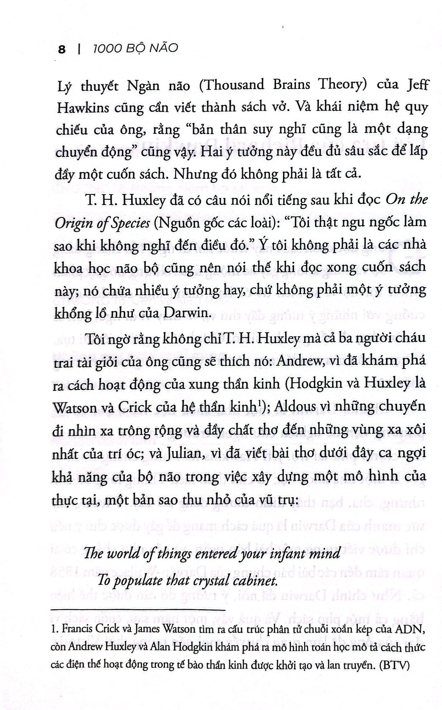 Với góc nhìn mới đầy thuyết phục này, Hawkins có thể đánh giá lại một số vấn đề hóc búa nhất của khoa học thần kinh, như tại sao cảm giác đau cần phải đau đớn mới hữu ích, làm sao chúng ta có thể hiểu rằng quan điểm của chúng ta về một vật thay đổi khi chúng ta di chuyển xung quanh nó và tại sao chúng ta có thể có ý thức nhưng các phần riêng lẻ của cơ thể chúng ta thì không.