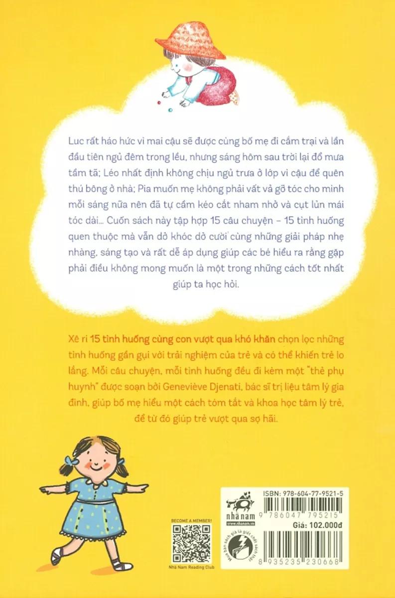 Xê ri 15 tình huống cùng con vượt qua khó khăn chọn lọc những tình huống gần gụi với trải nghiệm của trẻ và có thể khiến trẻ lo lắng. Mỗi câu chuyện, mỗi tình huống đều đi kèm một “thẻ phụ huynh” được soạn bởi Geneviève Djenati, bác sĩ trị liệu tâm lý gia đình, giúp bố mẹ hiểu một cách tóm tắt và khoa học tâm lý trẻ, để từ đó giúp trẻ vượt qua sợ hãi.