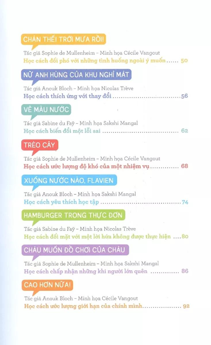 Luc rất háo hức vì mai cậu sẽ được cùng bố mẹ đi cắm trại và lần đầu tiên ngủ đêm trong lều, nhưng sáng hôm sau trời lại đổ mưa tầm tã; Léo nhất định không chịu ngủ trưa ở lớp vì cậu để quên thú bông ở nhà; Pia muốn mẹ không phải vất vả gỡ tóc cho mình mỗi sáng nữa nên đã tự cầm kéo cắt nham nhở và cụt lủn mái tóc dài… Cuốn sách này tập hợp 15 câu chuyện – 15 tình huống quen thuộc mà vẫn dở khóc dở cười cùng những giải pháp nhẹ nhàng, sáng tạo và rất dễ áp dụng giúp các bé hiểu ra rằng gặp phải điều không mong muốn là một trong những cách tốt nhất giúp ta học hỏi.
