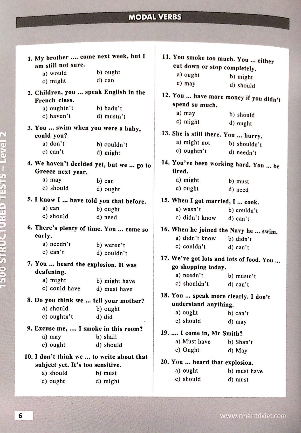 1500 Structured Tests Leve 2 là bộ sách gồm 3 quyển được thiết kế như bài tập bổ sung cùng sách giáo khoa. Người học sẽ điền vào khoảng trống với một danh từ, giới từ, trạng từ, tính từ hay động từ. ..Mỗi trang của cuốn sách sẽ có những bài tập với cấu trúc ngữ pháp khác nhau. Học viên cần nắm vững kiến thức mới có thể hoàn thành các dạng bài tập hoặc có thể cần đến sự hướng dẫn của giáo viên.