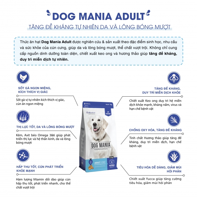 Mua tại TiktokTHÔNG TIN SẢN PHẨM THÀNH PHẦN Loại sản phẩm: Thức ăn cho chó Tên sản phẩm: Dog Mania Adult Dạng sản phẩm: Dạng viên Màu sắc hạt: Màu nâu Áp dụng: Chó trên 12 tháng tuổi Xuất xứ: Hàn Quốc Khối lượng: 2.4kg Bột thịt (bò, lợn, vịt), bột thịt gà, thịt gà thuỷ phân, mỡ gà, ngô, bột lúa mỳ, củ cải đường, chiết xuất keo ong, men ủ khô, chiết xuất yucca, chiết xuất từ hạt nho, chiết xuất rau diếp xoăn, chất chống oxy hoá tự nhiên (chiết xuất hương thảo, quercetin, catechin), zeolite, muối tinh, vitamin tổng hợp, khoáng tổng hợp, đá vôi, choline chloride. CÔNG DỤNG SẢN PHẨM