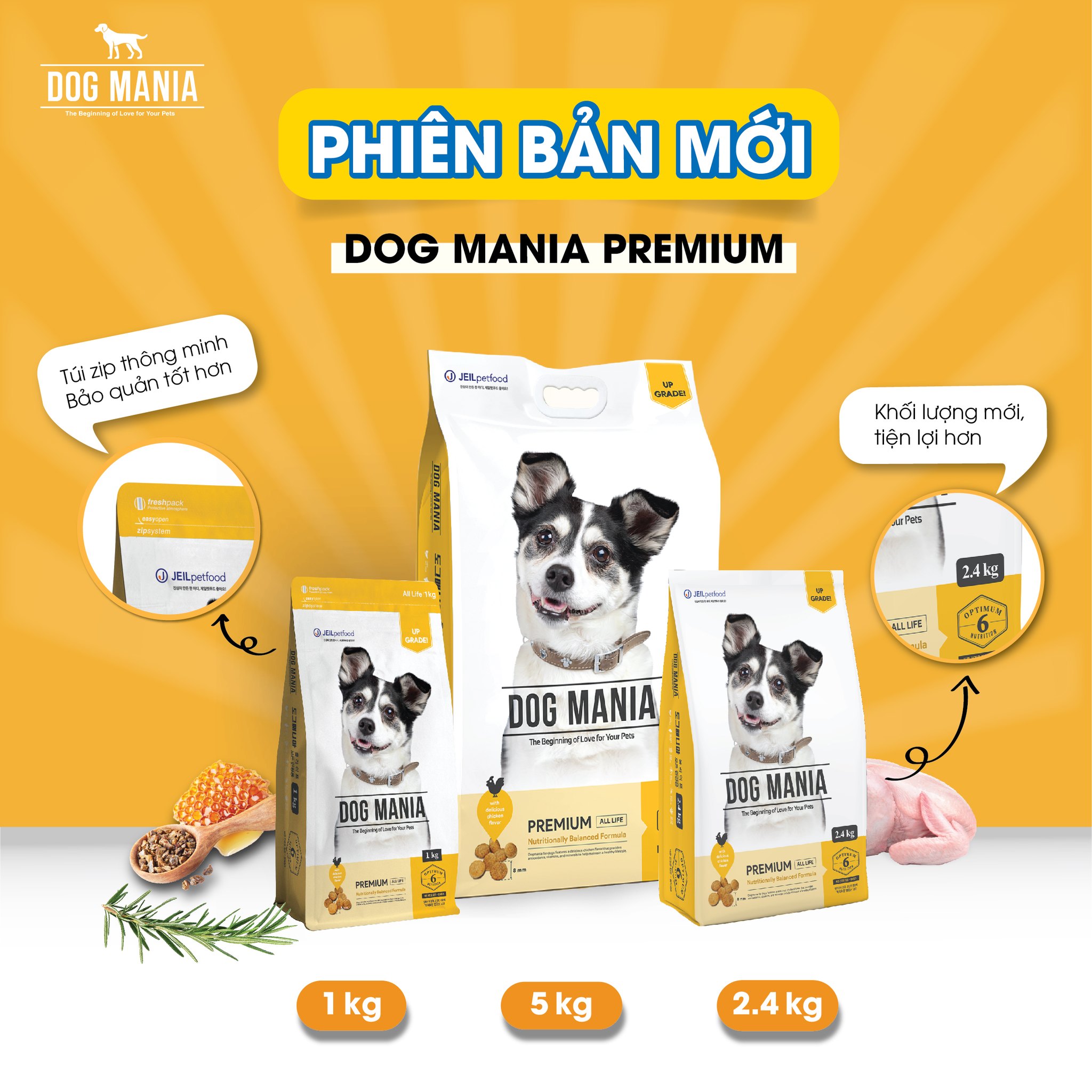 THỨC ĂN HẠT CHO CHÓ MỌI LỨA TUỔI DOG MANIA PREMIUM Thức ăn hạt dinh dưỡng cho chó Dog Mania Premium giúp hấp thu tốt, thể chất vượt trội. Không chỉ cung cấp nguồn dinh dưỡng toàn diện, chiết xuất keo ong và hương thảo giúp tăng đề kháng, duy trì miễn dịch tự nhiên. Sản phẩm phù hợp với chó mọi lứa tuổi. CÔNG DỤNG SẢN PHẨM Chiết xuất Keo ong là kháng sinh tự nhiên giúp duy trì nền tảng miễn dịch khỏe mạnh, đề kháng vượt trội, kháng nấm, virus và phòng ngừa bệnh khi giao mùa Tinh chất Hương thảo giúp tăng đề kháng, duy trì miễn dịch, hạn chế bệnh vặt Canxi, Photpho & Protein giúp phát triển hệ cơ và xương khớp chắc khỏe, dẻo dai Prebiotics là chất xơ hòa tan giúp tăng cường tiêu hóa, hỗ trợ sức khỏe đường ruột, cún hấp thu tốt Sốt gà vị tự nhiên kích thích vị giác, cún ăn ngon miệng Chiết xuất Yucca giúp tăng cường tiêu hóa, giảm mùi hôi phân PHÂN TÍCH GIÁ TRỊ DINH DƯỠNG Protein ≥ 22.0% Độ ẩm ≤ 12.0% Chất béo ≥ 12.0% Khoáng tổng số ≥ 10.0% Chất xơ ≤ 5.0% Canxi: 1.0 - 2.3% Photpho: 0.8 - 1.6%