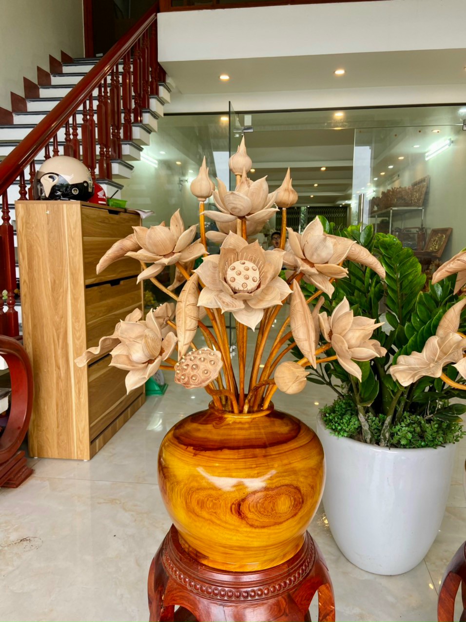 _ 1 bình hoa sen trang trí phòng khách phòng thờ được làm bằng chất liệu gỗ hương đỏ tự nhiên 100% _ Kt bình cắm cao 25×23cm +kt cao tổng hoa lá gương 82cm