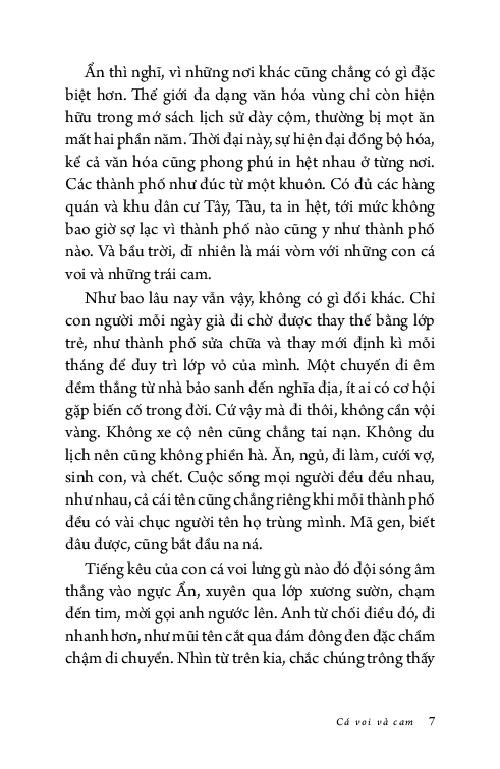 Ẩn không dám nhìn lên, anh chỉ muốn tránh bầu trời đẹp đẽ ấy, muốn nhanh nấp vào công ty để nhìn những trần nhà xám lạnh tẻ nhạt. Sự tẻ nhạt an toàn cố hữu, như triệu năm rồi vẫn vậy, có thể tìm thấy ở bất kì đâu trong kí ức: buồn chán và cứng ngắc. Còn hơn phải nhìn thấy bầy cá voi bơi giữa những trái cam, tất cả đều khổng lồ, tươi sáng và hiền hòa tới mức giả tạo.”