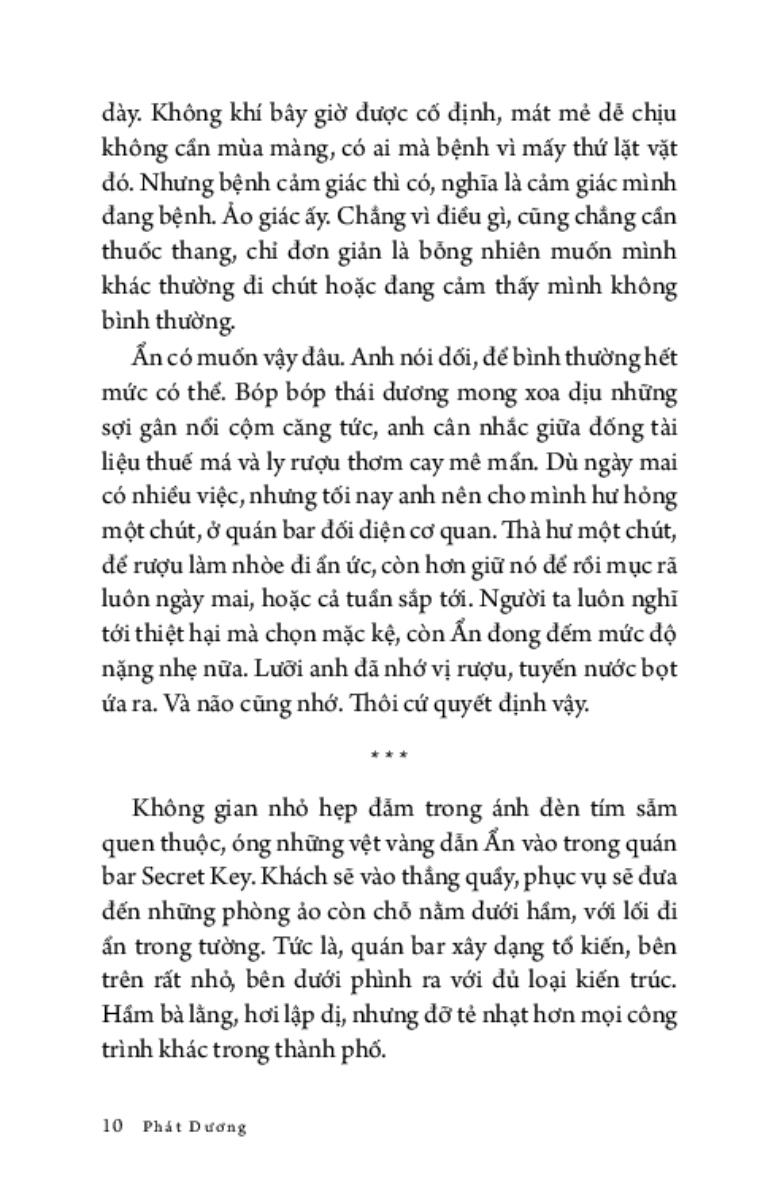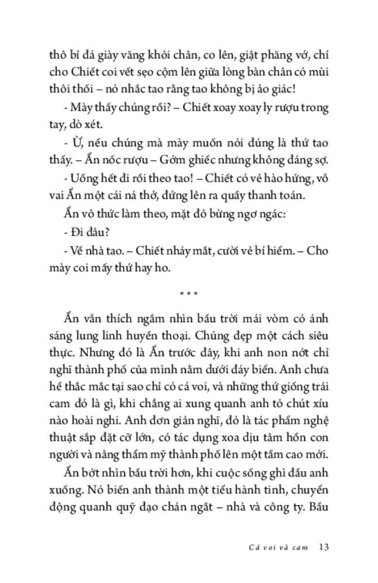 Ẩn không dám nhìn lên, anh chỉ muốn tránh bầu trời đẹp đẽ ấy, muốn nhanh nấp vào công ty để nhìn những trần nhà xám lạnh tẻ nhạt. Sự tẻ nhạt an toàn cố hữu, như triệu năm rồi vẫn vậy, có thể tìm thấy ở bất kì đâu trong kí ức: buồn chán và cứng ngắc. Còn hơn phải nhìn thấy bầy cá voi bơi giữa những trái cam, tất cả đều khổng lồ, tươi sáng và hiền hòa tới mức giả tạo.”