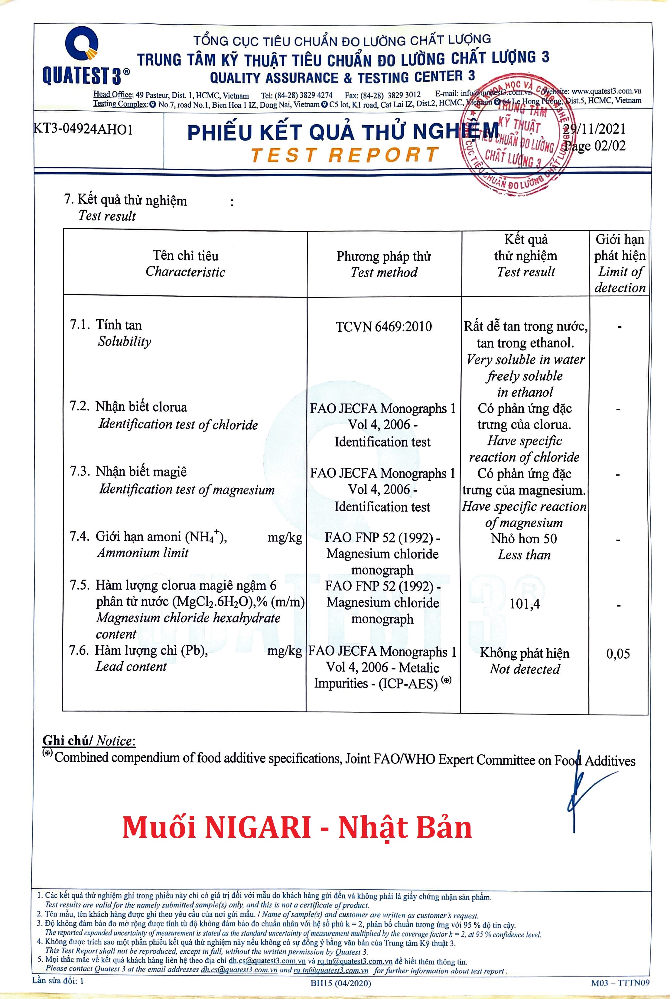 : Hàm lượng MgCl2.6H2O tinh khiết 101,4%