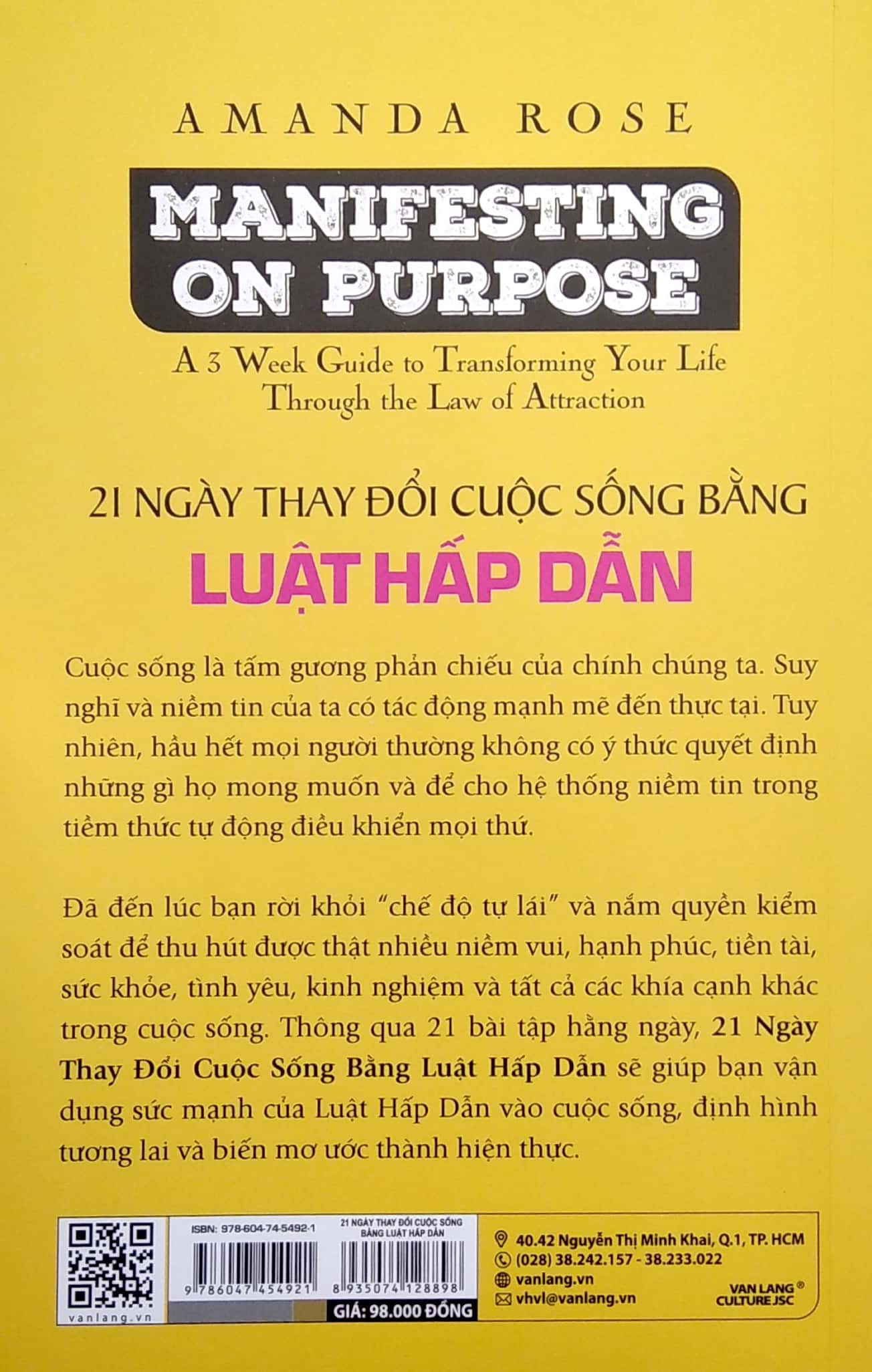 21 Ngày Thay Đổi Cuộc Sống Bằng Luật Hấp Dẫn Cuộc sống là tấm gương phản chiếu của chính chúng ta. Suy nghĩ và niềm tin của ta có tác động mạnh mẽ đến thực tại. Tuy nhiên, hầu hết mọi người thường không có ý thức quyết định những gì họ mong muốn và để cho hệ thống niềm tin trong tiềm thức tự động điều khiển mọi thứ. Đã đến lúc bạn rời khỏi chế độ tự lái” và nắm quyền kiểm soát để thu hút được thật nhiều niềm vui, hạnh phúc, tiền tài, sức khỏe, tình yêu, kinh nghiệm và tất cả các khía cạnh khác trong cuộc sống. Thông qua 21 bài tập hằng ngày, 21 Ngày Thay Đổi Cuộc Sống Bằng Luật Hấp Dẫn sẽ giúp bạn vận dụng sức mạnh của Luật Hấp Dẫn vào cuộc sống, định hình tương lai và biến mơ ước thành hiện thực.
