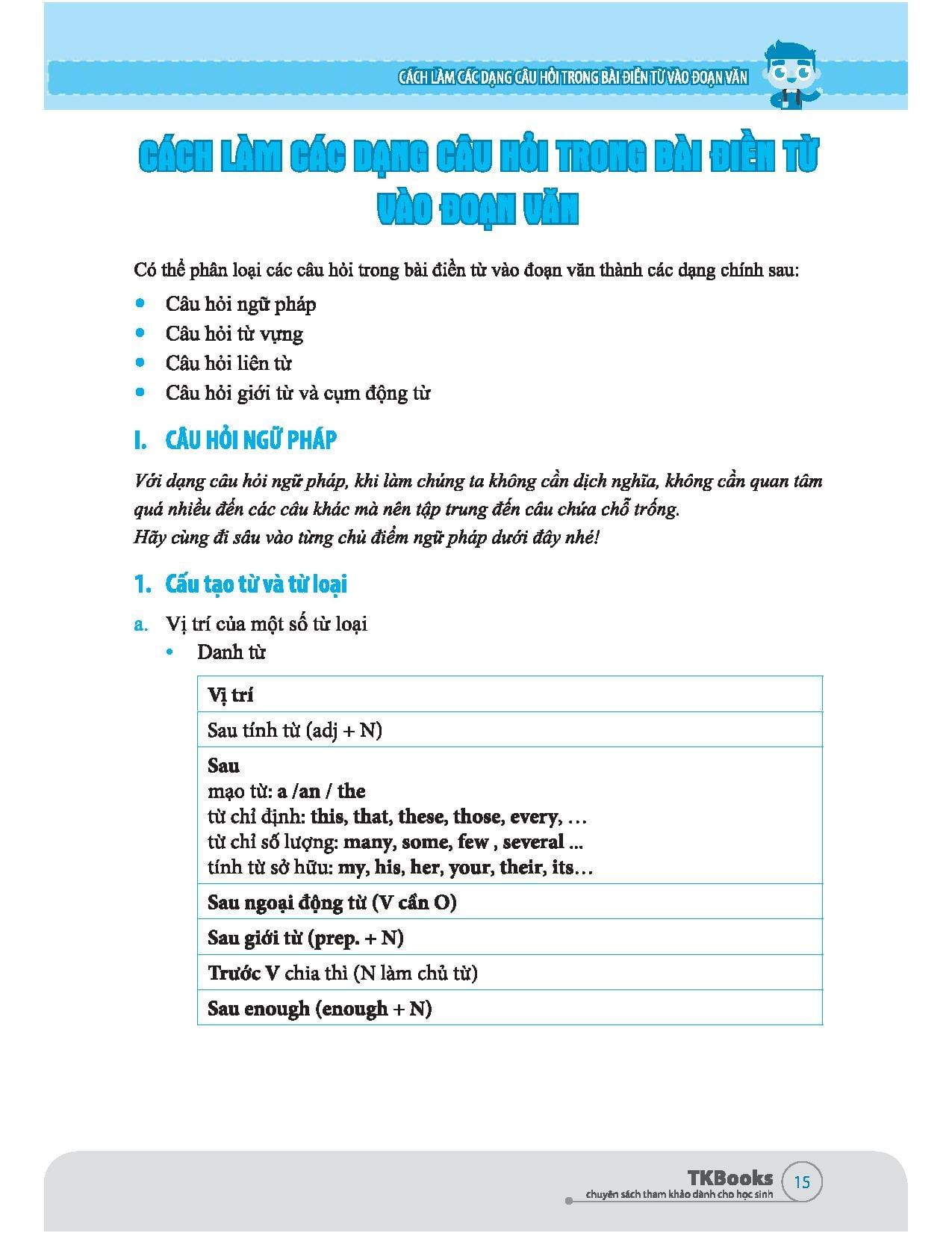 Bên cạnh đó, cuốn sách còn đi sâu vào phân tích 4 dạng câu hỏi trong bài điền từ giúp các em nắm chắc cấu trúc đề thi một cách nhanh nhất: