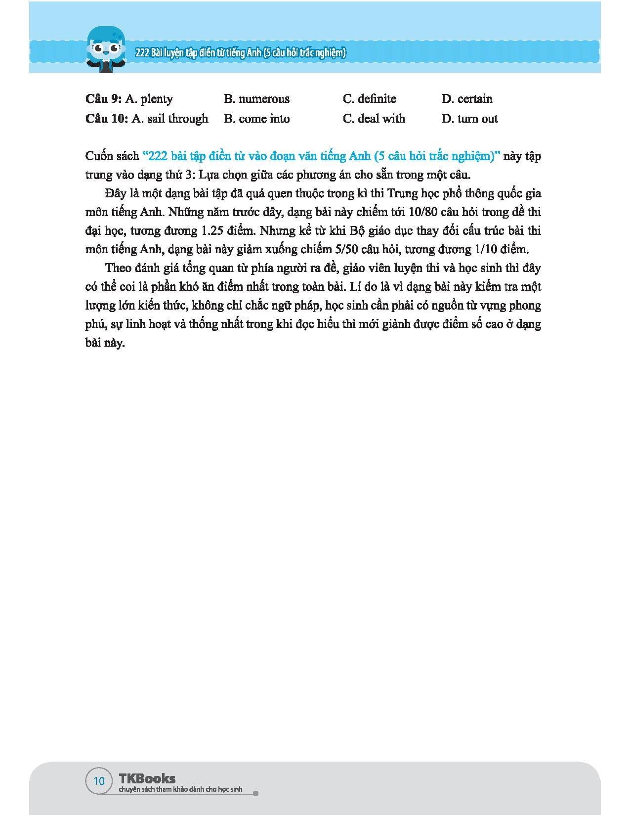 Cuốn sách “222 bài luyện tập điền từ tiếng Anh” đã bật mí bí kíp làm bài siêu độc đáo cho kỳ thi THPT Quốc gia. Đây là một công cụ tuyệt diệu giúp bạn dễ dàng chinh phục điểm 9, điểm 10 trong kỳ thi.