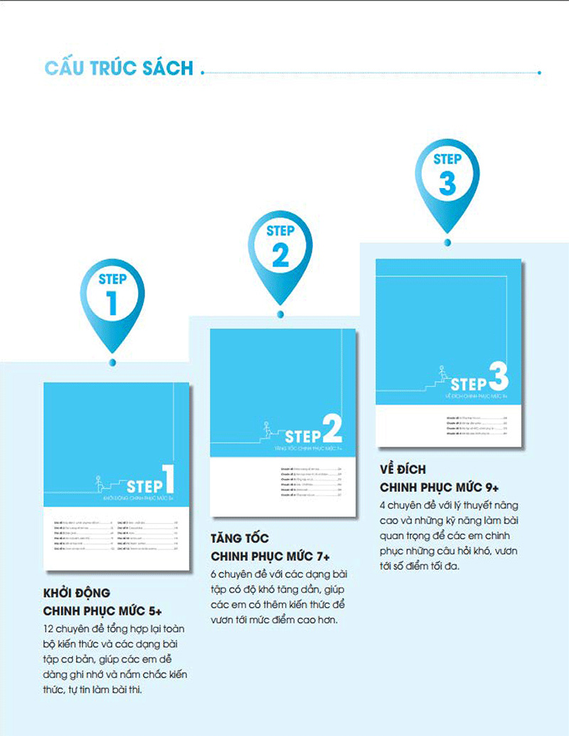 Chính vì thế, bộ sách 3 Step – Tiết lộ bí quyết 3 bước đạt điểm 8+ được ra đời với mục đích giúp các em định hướng lộ trình và hệ thống kiến thức một cách bài bản, dễ học nhất – Với độ khó tăng dần, tương ứng với mức điểm thi mục tiêu tăng dần.