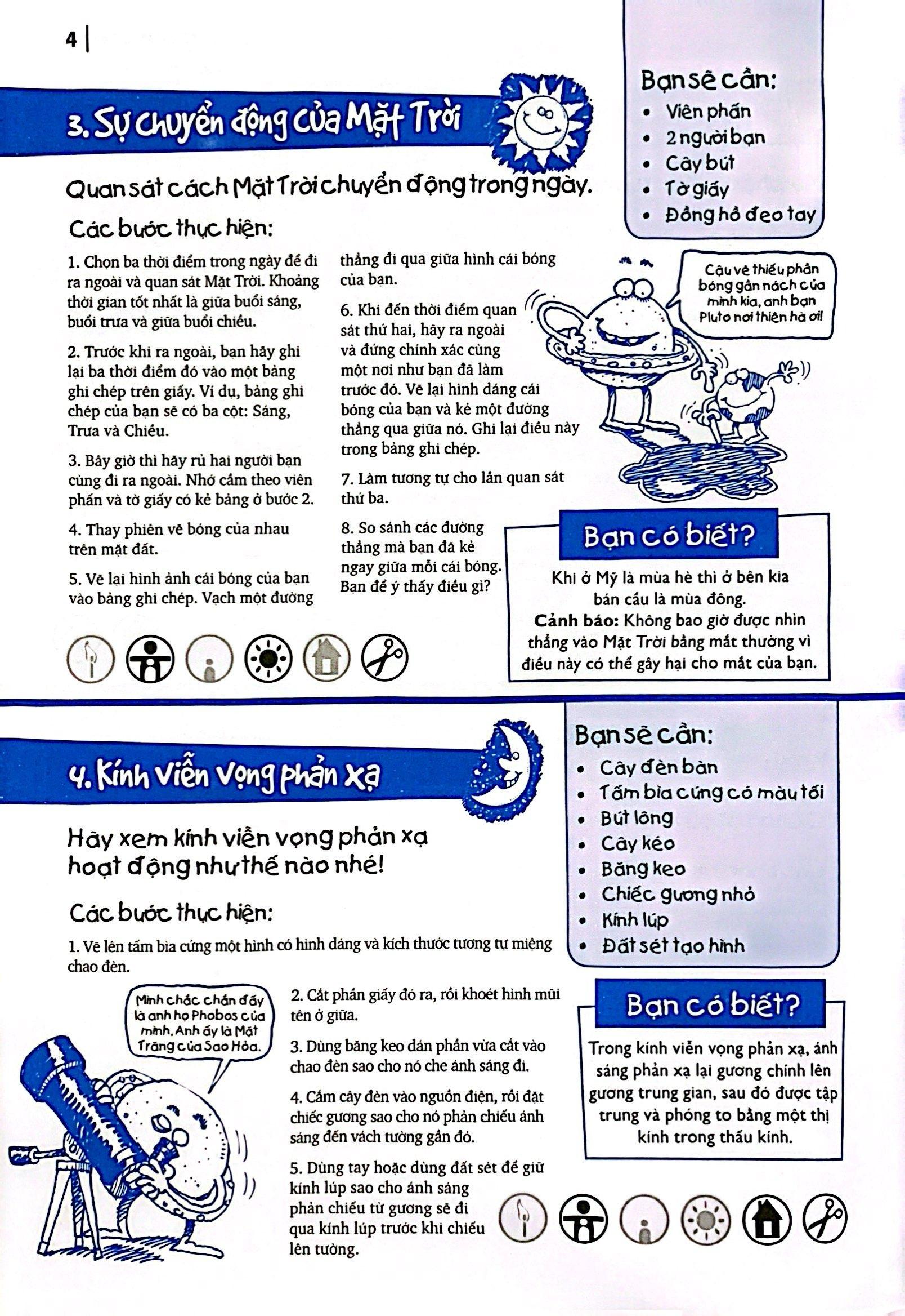Tác giả luôn ghi chú ở phần đầu mỗi thí nghiệm những dụng cụ cần thiết và nơi các em nên thực hiện thí nghiệm để tránh gây ảnh hưởng đến mọi người và lưu ý những thí nghiệm nào thì cần sự hỗ trợ từ người lớn. Các thí nghiệm được minh họa rõ ràng từng bước giúp các em dễ dàng thao tác mà vẫn đảm bảo an toàn.
