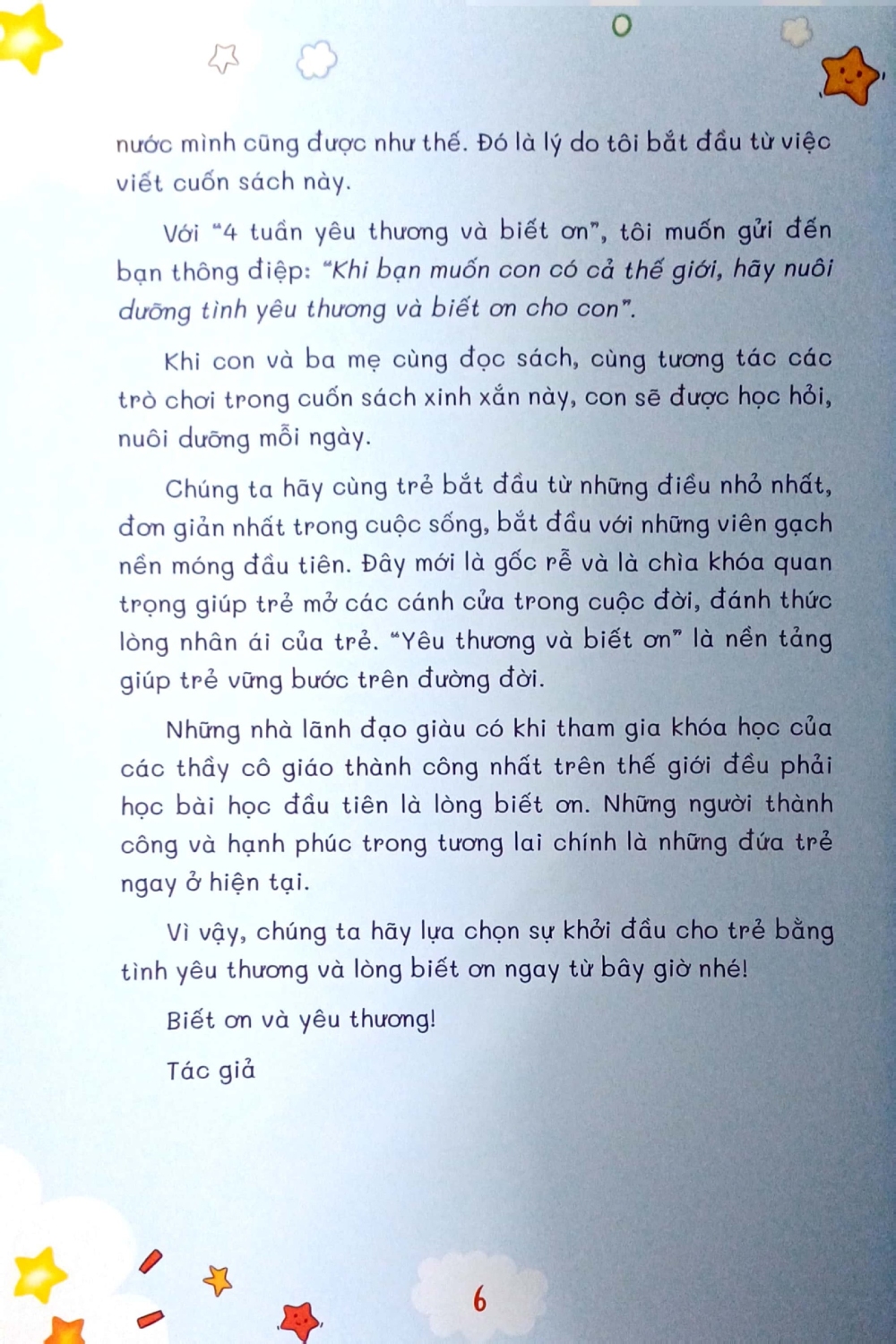 4 Tuần Yêu Thương Và Biết Ơn – Sách Hay Con Đọc Mỗi Ngày là cuốn sách đầu tay của nhà giáo Nghiêm Thị Thủy. Hướng đến các em học sinh thuộc giai đoạn cuối cấp mầm non - đầu cấp tiểu học, cuốn sách là bài học thực hành mỗi ngày về lòng yêu thương và biết ơn trong vòng 4 tuần, bao gồm 4 chủ đề: Cơ thể, Gia đình - cộng đồng, Trường lớp, Những điều xung quanh trong cuộc sống. Nhờ việc lồng ghép các mối tương tác trực tiếp và gián tiếp đến đời sống hằng ngày của trẻ em, mỗi bài học trong 4 tuần yêu thương và biết ơn sẽ mang đến kiến thức khái quát, cơ bản nhất về những sự vật, sự việc, hiện tượng giúp trẻ hiểu biết về chính mình, về cuộc sống, thông qua đó hướng dẫn và giáo dục trẻ về lòng yêu thương, biết ơn.