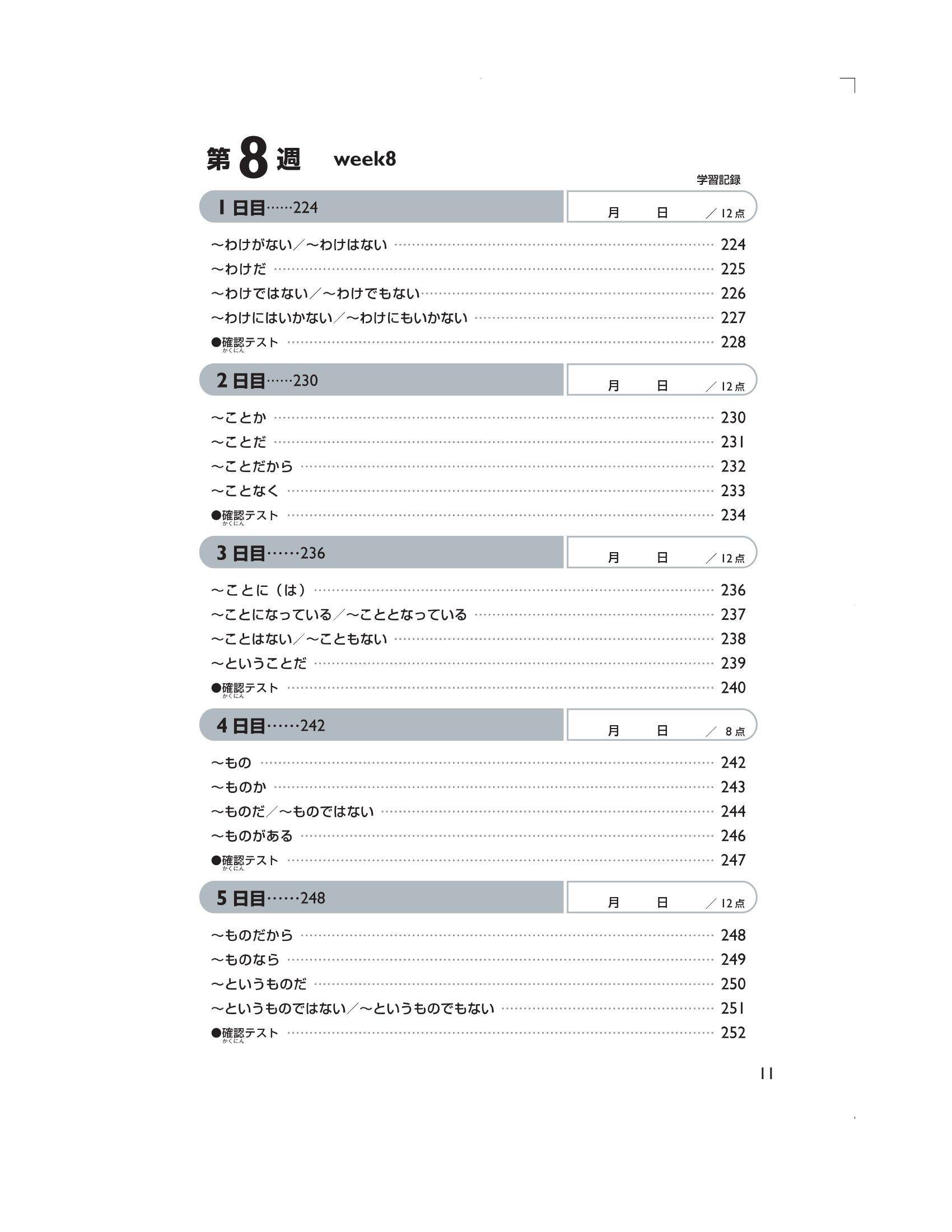 Trong phần này, chúng tôi đưa ra những Hán tự cần học, cách đọc của chúng (cách đọc âm kun ký hiệu bằng Hiragana, âm on ký hiệu bằng Katakana) và những câu ví dụ sử dụng những Hán tự trên. Mẫu câu đặc biệt tập trung vào việc đưa ra cách đọc và từ vựng chủ yếu dành cho trình độ N2. Ngoài ra, sẽ có bài kiểm tra lượng từ đã học mỗi ngày (khoảng 12 Hán tự). Đáp án được in tại phần dưới trang sách của ngày học tiếp theo. Hơn nữa, sẽ có câu hỏi thử thách ở ngày thứ 5 tuần thứ 4 và ngày thứ 5 tuần thứ 9.
