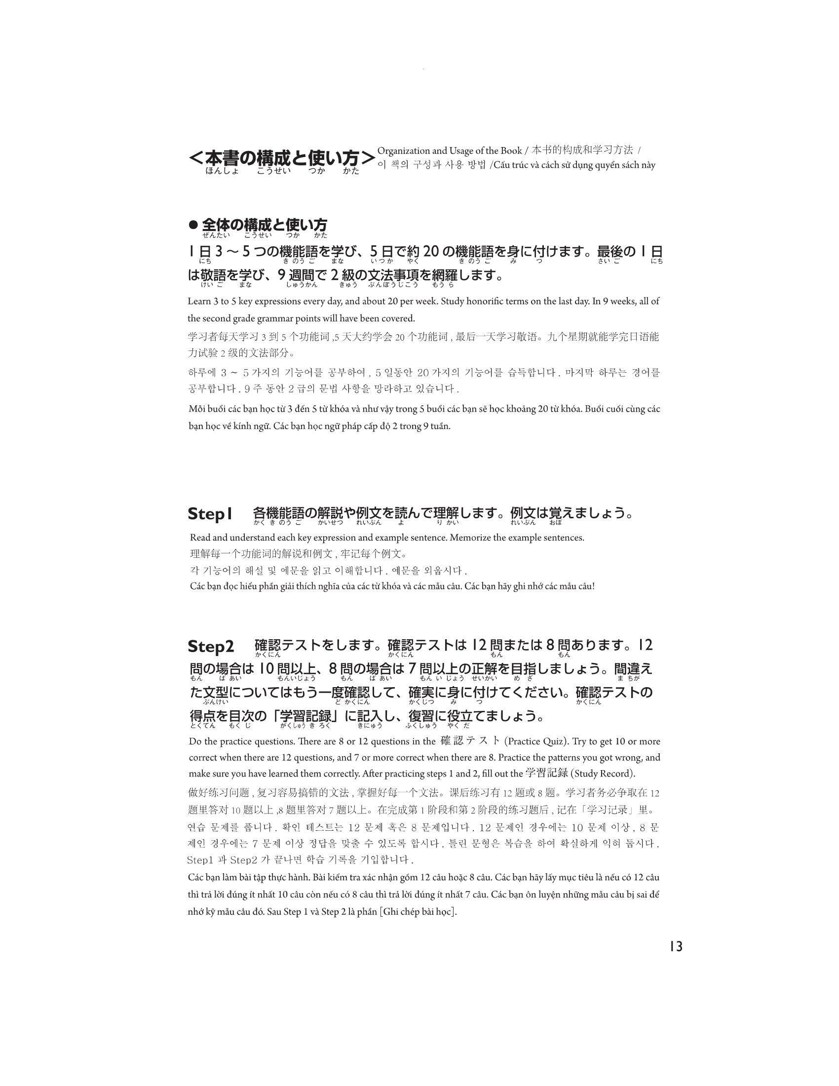 Sau phần học Hán tự và từ vựng mỗi ngày, sẽ có một bài kiểm tra. Học từ mới xong, hãy kiểm tra lại xem bản thân mình đã nắm vững được bài hay chưa. Việc tích lũy dần kiến thức rất quan trọng. Ngoài ra cũng có thể kiểm tra đã hiểu bài bằng danh sách Hán tự và Từ vựng ở cuối sách.