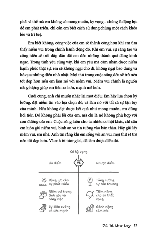 “74 Lá Thư Tay – Đổi Hình là Đổi Đời” không phải một cuốn sách kỹ năng thông thường. Nó là tập hợp những lá thư từ một hành trình thật, đau thật, tỉnh thật, đổi thật. Từng lá thư là sự dẫn đường thấu hiểu, đồng cảm sâu sắc nên chia sẻ đủ mạnh để khiến bạn giật mình nhận ra: “Mình đã bỏ quên bản thân quá lâu”.