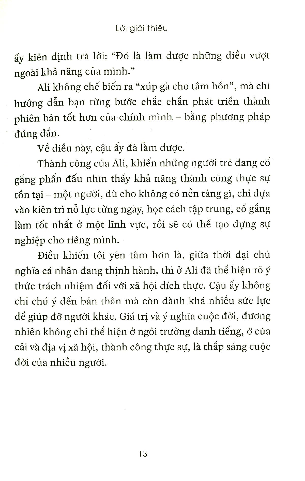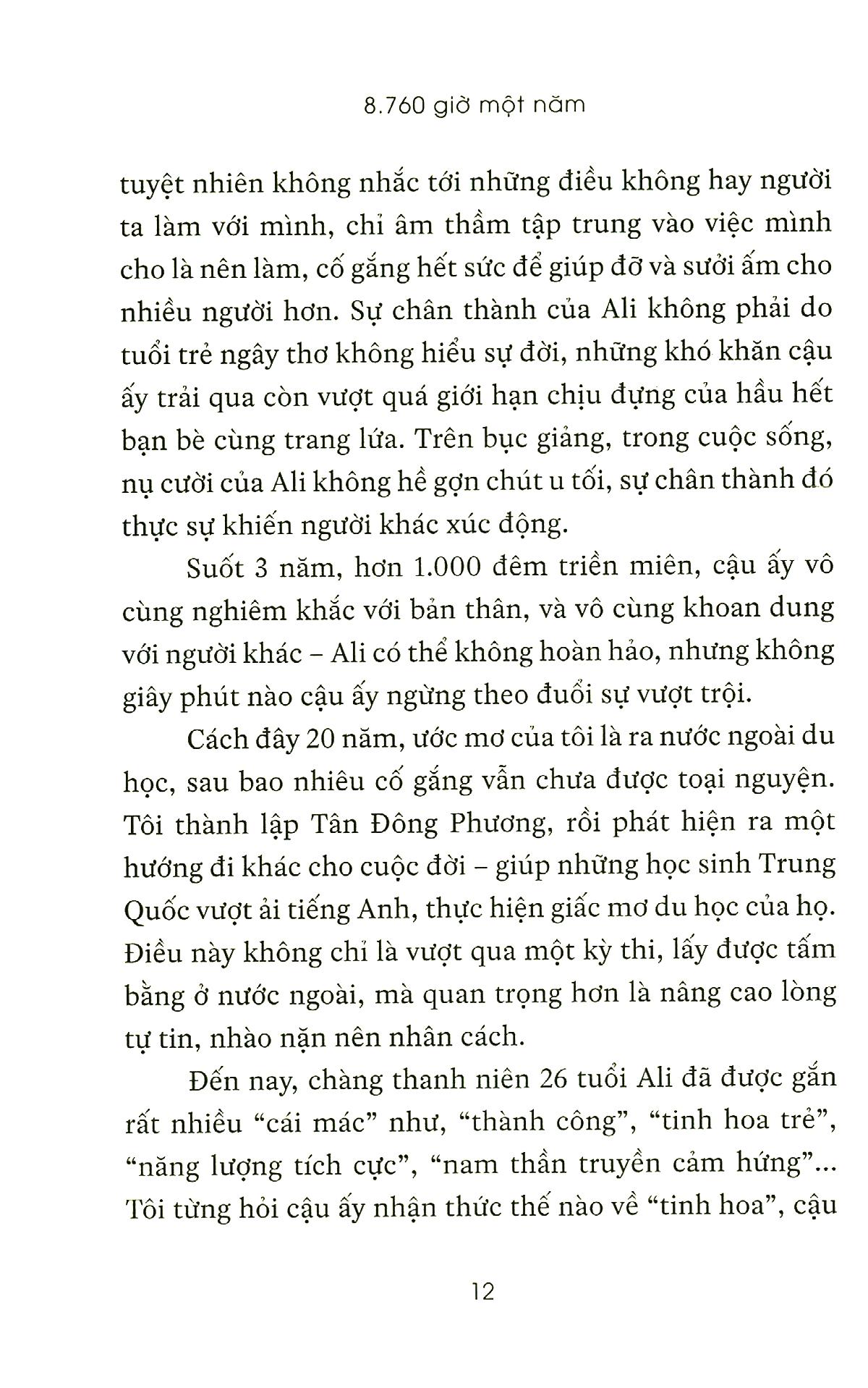 8.760 Giờ Một Năm - Bí Quyết Biến Thời Gian Thành Vàng Ai cũng cần sức mạnh để lay động bản thân. Nhưng nếu một cuốn sách chỉ khiến bạn thấy cảm động, mà không dạy bạn về phương pháp, chứng tỏ nó chưa có ích nhiều cho bạn. Trong cuốn sách này, Ali đã mang tới nhiều phương pháp nhằm giúp bạn nâng cao chất lượng cuộc sống của m.ình, trong đó quan trọng nhất dường như là phương pháp quản lý thời gian cùng những công cụ được chứng minh có hiệu quả, có thể giúp ta vừa có đủ thời gian để nghỉ ngơi giải trí, vừa đảm bảo hoàn thành công việc và học tập trong khoảng thời gian ngắn nhất với chất lượng cao. Qua từng chương sách, bạn có thể bước từng bước nhỏ vững vàng, dần dần đi được xa hơn, đến gần hơn với ước mơ của m.ình. ALI tên thật là Nurali Abliz người dân tộc Duy Ngô Nhĩ, Tân Cương. Tốt nghiệp Đại học Bắc Kinh. Diễn thuyết gia và giáo viên tiếng Anh trực thuộc tập đoàn Tân Đông Phương, từng tham gia nhiều show truyền hình thực tế. Sáng tạo ra phương pháp quản lý thời gian 34 đồng tiền vàng giúp ích cho hàng trăm triệu người và app học tiếng Anh nổi tiếng Cool English với hơn 10 triệu lượt tải về trên appstore.