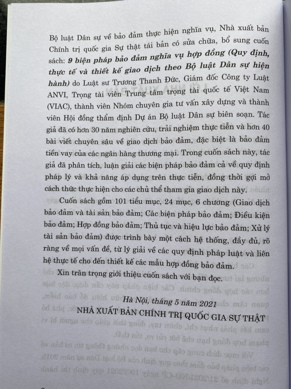 Cuốn sách “9 Biện Pháp Bảo Đảm Nghĩa Vụ Hợp Đồng” gồm 101 tiểu mục, 24 mục, 6 chương (Giao dịch bảo đảm và tài sản bảo đảm; Các biện pháp bảo đảm; Điều kiện bảo đảm; Hợp đồng bảo đảm; Thủ tục và hiệu lực bảo đảm; Xử lý tài sản bảo đảm) được trình bày một cách hệ thống, đầy đủ, rõ ràng về mọi vấn đề, từ lý giải về các quy định pháp luật và liên hệ thực tế cho đến thiết kế các mẫu hợp đồng bảo đảm.