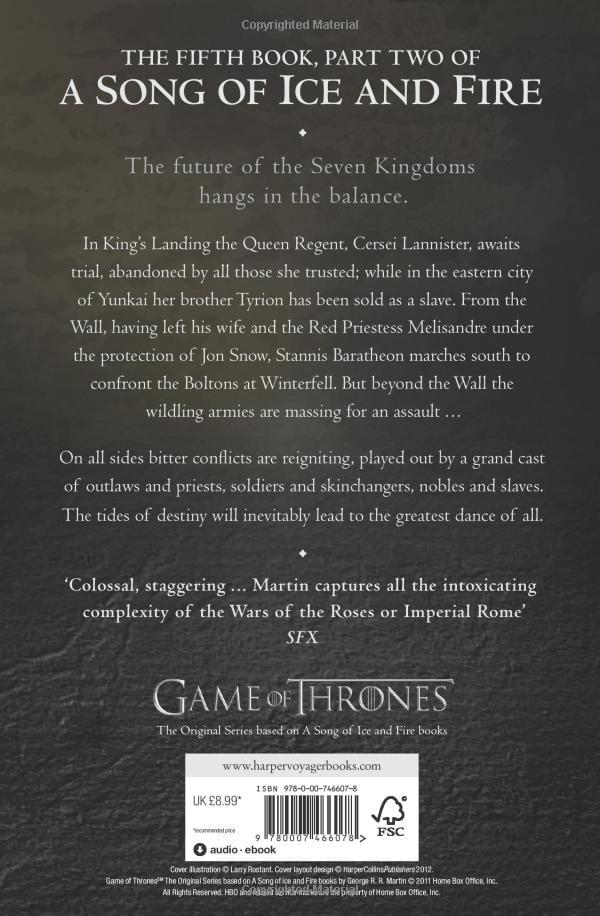 HBO's hit series A GAME OF THRONES is based on George R R Martin's internationally bestselling series A SONG OF ICE AND FIRE, the greatest fantasy epic of the modern age. A DANCE WITH DRAGONS: AFTER THE FEAST is the SECOND part of the fifth volume in the series. 'Vivid, rich, multi-layered and utterly addictive' Daily Express. The future of the Seven Kingdoms hangs in the balance. In King's Landing the Queen Regent, Cersei Lannister, awaits trial, abandoned by all those she trusted; while in the eastern city of Yunkai her brother Tyrion has been sold as a slave. From the Wall, having left his wife and the Red Priestess Melisandre under the protection of Jon Snow, Stannis Baratheon marches south to confront the Boltons at Winterfell. But beyond the Wall the wildling armies are massing for an all sides bitter conflicts are reigniting, played out by a grand cast of outlaws and priests, soldiers and skinchangers, nobles and slaves. The tides of destiny will inevitably lead to the greatest dance of all.