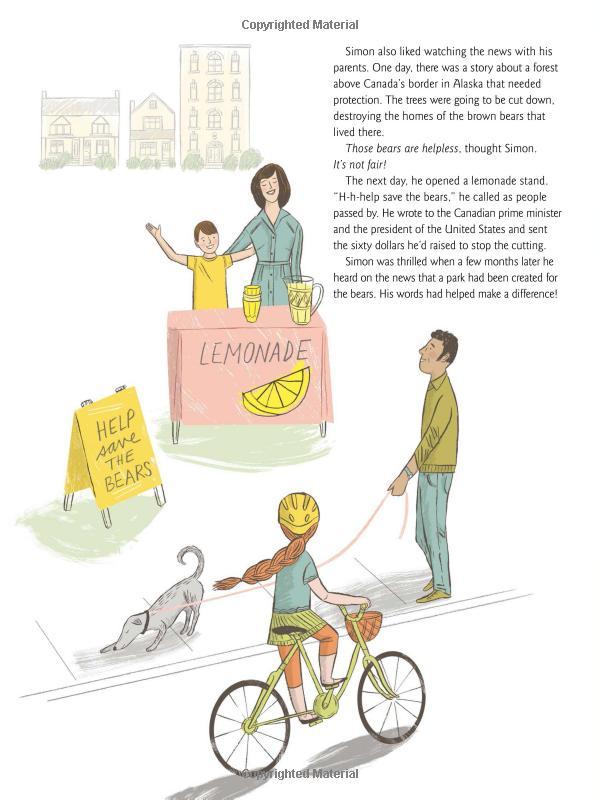 Carmen Oliver's inspiring true story is based on the early life of Simon Jackson, who founded the Spirit Bear Youth Coalition. On his remarkable journey to protect the spirit bears, he met Dr. Jane Goodall and eventually hiked the Great Bear Rainforest --- the home of these elusive animals. Katy Dockrill's captivating art adds depth and beauty to the story. Photos and additional details about Simon Jackson's life and about spirit bears are included in the end matter. Part of the CitizenKid collection, this book demonstrates how one child can be a voice for change. Simon's story is an excellent example of growth mindset at work, highlighting personal growth and overcoming obstacles through activism. This book can also be used to lead discussions about character education as it relates to courage, resilience and perseverance. In addition, it has strong science curriculum links to the environment, animal habitats and the effects of clear-cutting.