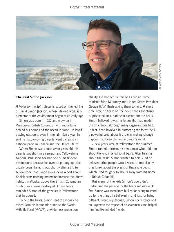 As a child, Simon Jackson found navigating the world of the school playground difficult. He felt most at home in the woodlands, learning about and photographing wildlife. As a teenager, he became fascinated with spirit bears, a rare subspecies of black bear with creamy white fur. These elusive creatures were losing their habitat to deforestation, and Simon knew he had to do something to protect them. He decided he would become the voice for the spirit bears. But first, he would have to find his own.