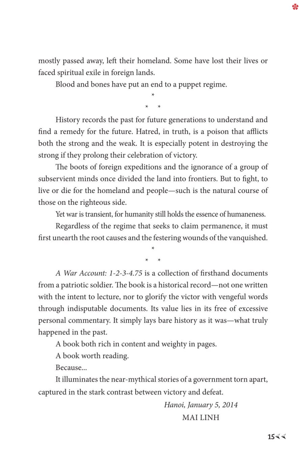 version of the book A War Account: 1-2-3-4.75 by journalist and writer Tran Mai Hanh was first published by the National Political Publishing House in April 2014. It has been continuously reprinted in 2015, 2016,2017, 2020 and 2025, and well-received as well as highly appreciated by readers. It has also won prestigious national and regional awards, including the2014 Literature Award from the Vietnam Writers’ Association and the 2015 S.E.A. Write Award. In 2017, the work was first translated into English, followed by translations into Lao in 2018 and Spanish in 2022 to introduce it to international readers. Since then, it has become one of the key publications promoting Vietnam’s diplomatic efforts.