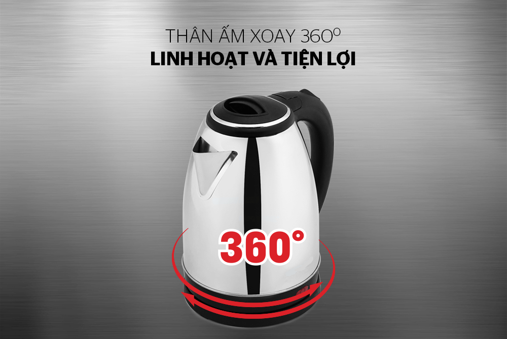 - Thân ấm xoay 360 độ linh hoạt trên đế tiếp điện Đế tiếp điện được thiết kế độc lập, tách rời khỏi thân ấm, giúp việc đổ nước – tiếp nước dễ dàng, linh hoạt. Ấm có thể xoay 360 độ trên đế tiếp điện, người dùng có thể đặt ấm lên hay nhấc ấm ra khỏi đế ở bất cứ góc nào mà không phải lo lắng đến vấn đề phải đặt sao cho khớp. Đun sôi nhanh – An toàn tuyệt đối
