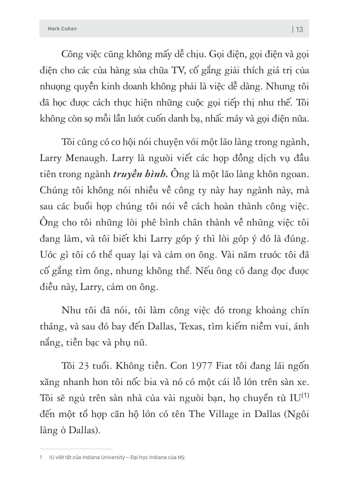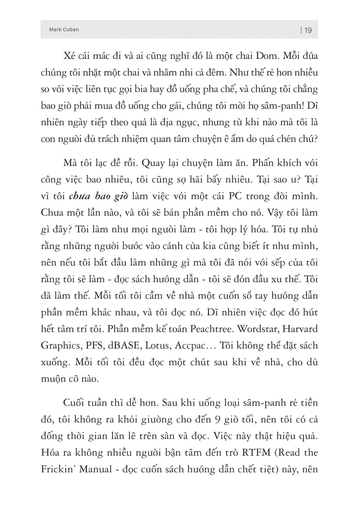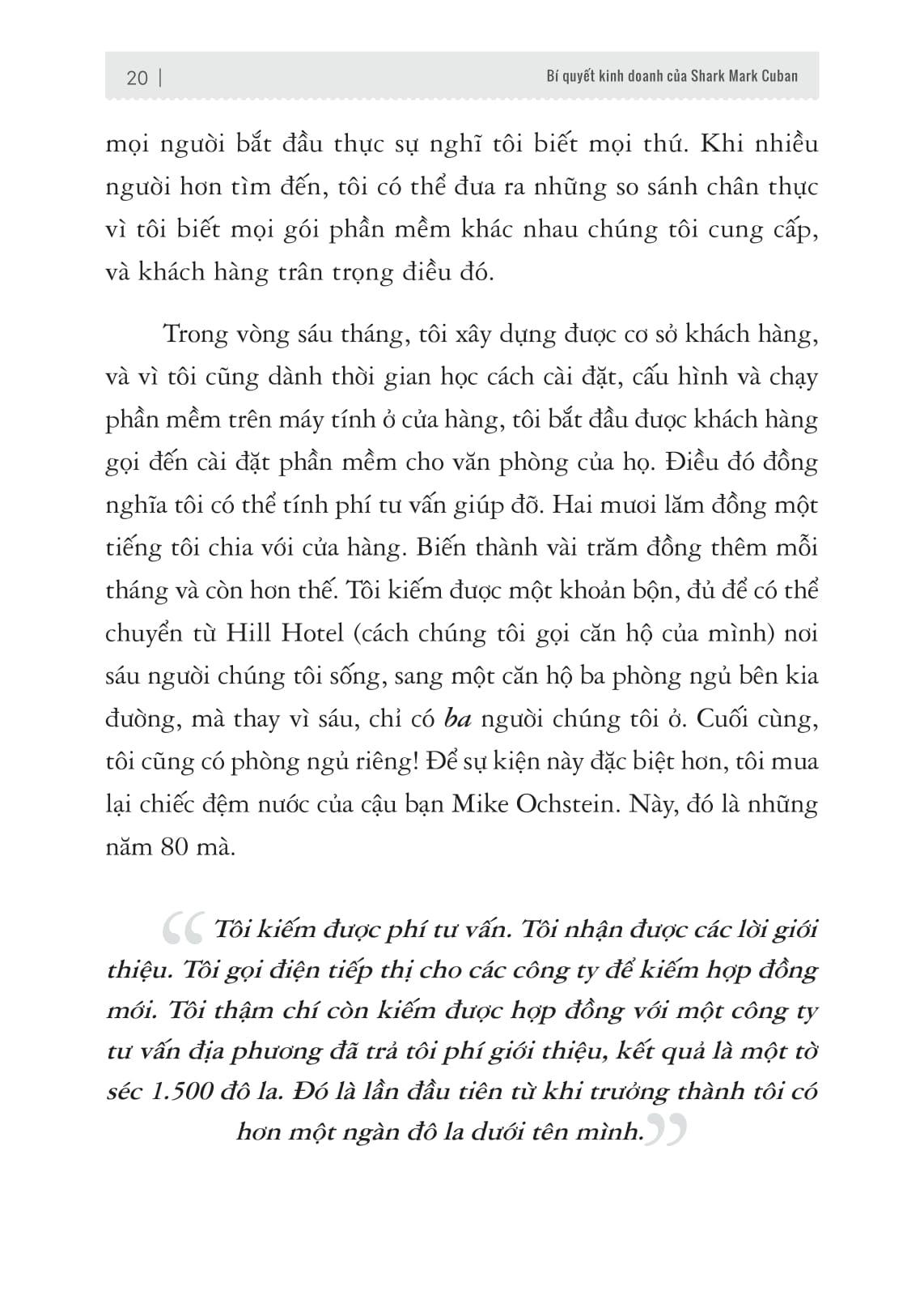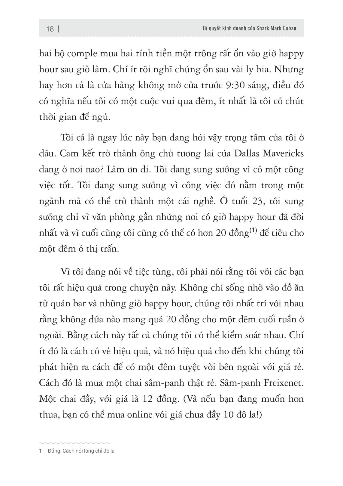 Trong cuốn sách đầu tay này Mark Cuban tiết lộ toàn bộ quá trình thay đổi tư duy cũng như quan điểm sống chỉ trong vài năm ngắn ngủi, để đưa ông từ một kẻ tay trắng trở thành một doanh nhân tỷ phú. Quan trọng hơn với những điều Mark chia sẻ sẽ giúp bạn làm chủ những tư duy, thói quen và công cụ của một doanh nhân thành đạt. Mô phỏng và làm theo cách mà người thành công chắc chắn bạn sẽ đạt được những kết quả tương tự