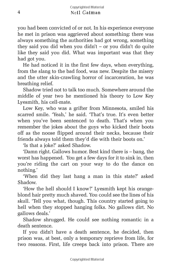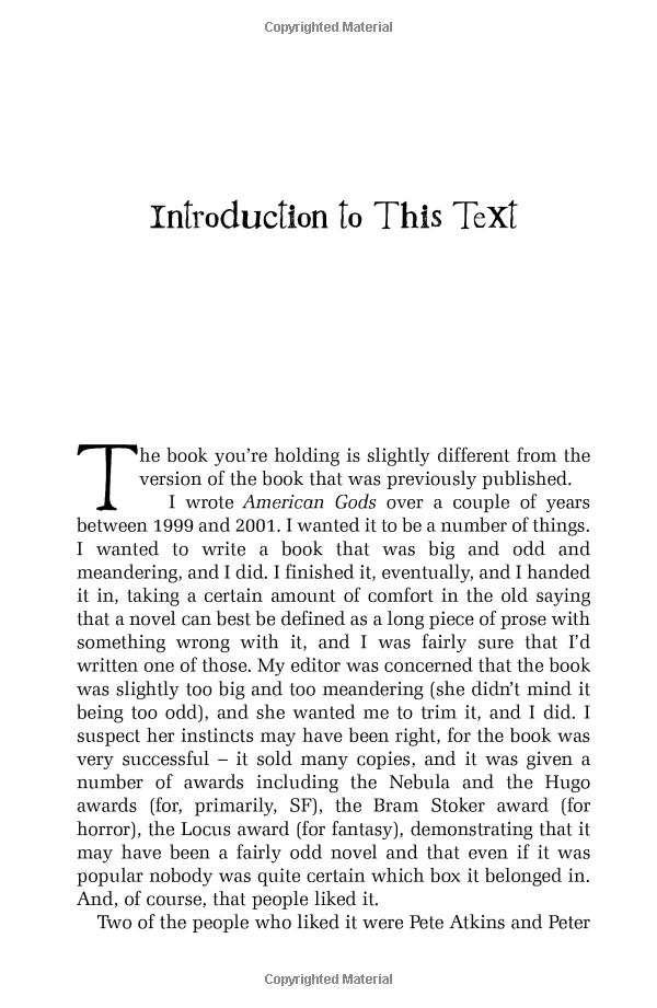 First published in 2001, American Gods became an instant classic, lauded for its brilliant synthesis of “mystery, satire, sex, horror, and poetic prose” (Washington Post) and as a modern phantasmagoria that “distills the essence of America” (Seattle Post-Intelligencer). It is the story of Shadow—released from prison just days after his wife and best friend are killed in an accident—who gets recruited to be bodyguard, driver, and errand boy for the enigmatic trickster, Mr. Wednesday. So begins Shadow’s dark and strange road trip, one that introduces him to a host of eccentric characters whose fates are mysteriously intertwined with his own. For, beneath the placid surface of everyday life, a storm is brewing—an epic war for the very soul of America—and Shadow is standing squarely in its path.
