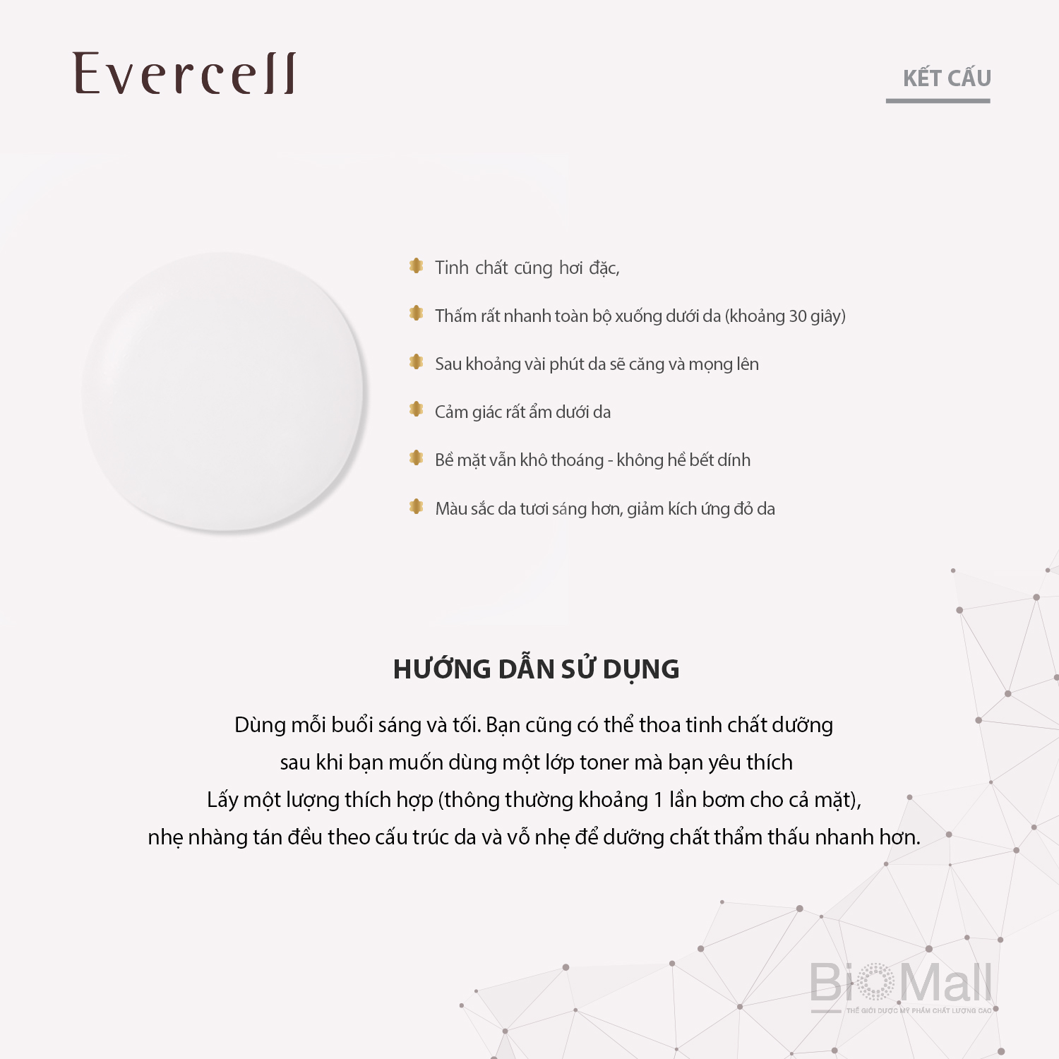 1. Công dụng: Sản phẩm cung cấp dưỡng chất cho da, giúp da mềm mại, mịn màng, hỗ trợ làm sáng màu da và hỗ trợ làm giảm nếp nhăn trên da. Sản phẩm chỉ