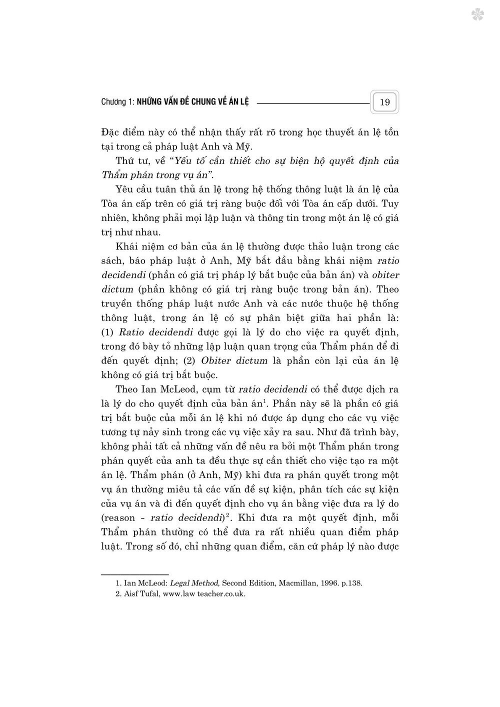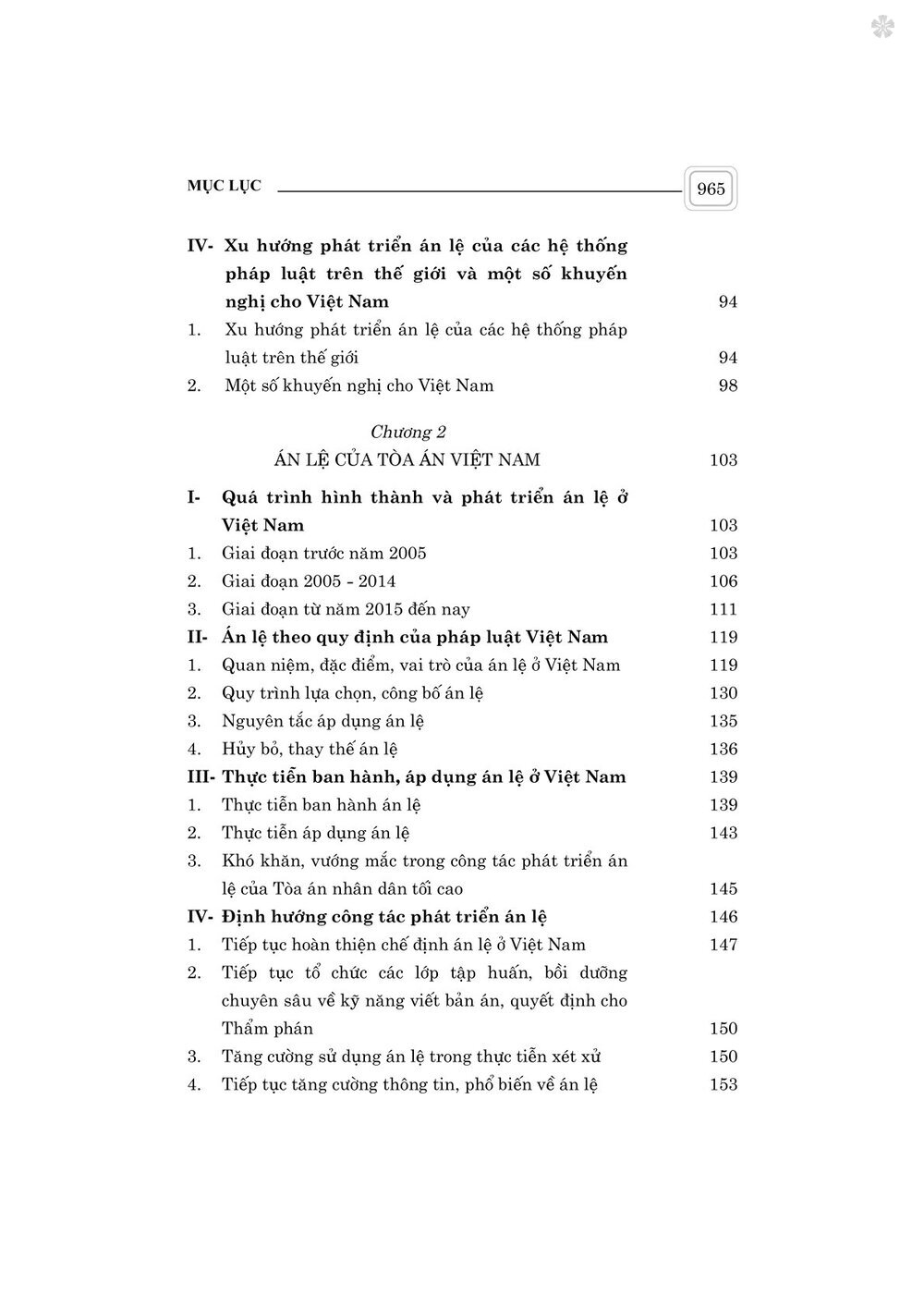 Trên cơ sở khái quát quá trình phát triển án lệ ở Việt Nam và kinh nghiệm xây dựng, áp dụng án lệ ở một số quốc gia trên thế giới, cuốn sách chuyên khảo Án lệ Việt Nam phân tích thực trạng áp dụng án lệ trong thực tiễn xét xử và khuyến nghị một số giải pháp nhằm nâng cao chất lượng quá trình nghiên cứu, đề xuất, công bố và áp dụng án lệ. Ngoài 3 chương chính, phần phụ lục của cuốn sách giới thiệu toàn văn 72 án lệ đã được công bố và phát triển từ các bản án, quyết định của Tòa án nhân dân các cấp. Đây là thành tựu quan trọng trong cải cách hoạt động tư pháp của ngành Tòa án nói chung, cũng như từ đóng góp của các tổ chức, nhà khoa học pháp lý, chuyên gia, luật sư trong hoạt động xây dựng và phát triển án lệ. Cuốn sách là tài liệu quý trong việc tìm hiểu, nghiên cứu và viện dẫn án lệ cho các Thẩm phán, Hội thẩm và các chức danh tư pháp của Tòa án, cũng như bạn đọc quan tâm đến vấn đề này. Trân trọng giới thiệu cuốn sách với bạn đọc