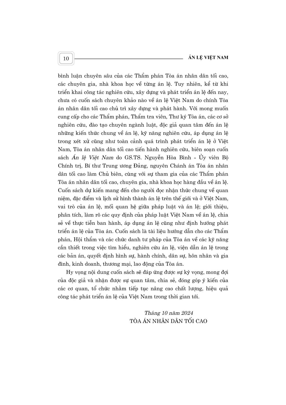Với mong muốn cung cấp cho các Thẩm phán, Thẩm tra viên, Thư ký Tòa án, các cơ sở nghiên cứu, đào tạo chuyên ngành luật, độc giả quan tâm đến án lệ những kiến thức chung về án lệ, kỹ năng nghiên cứu, áp dụng án lệ trong xét xử cũng như toàn cảnh quá trình phát triển án lệ ở Việt Nam, Tòa án nhân dân tối cao tiến hành nghiên cứu, biên soạn cuốn sách Án lệ Việt Nam do GS.TS. Nguyễn Hòa Bình Ủy viên Bộ Chính trị, Bí thư Trung ương Đảng, nguyên Chánh án Tòa án nhân dân tối cao làm Chủ biên, cùng với sự tham gia của các Thẩm phán Tòa án nhân dân tối cao, chuyên gia, nhà khoa học hàng đầu về án lệ. Cuốn sách dự kiến mang đến cho người đọc nhận thức chung về quan niệm, đặc điểm và lịch sử hình thành án lệ trên thế giới và ở Việt Nam, vai trò của án lệ, mối quan hệ giữa pháp luật và án lệ; giới thiệu, phân tích, làm rõ các quy định của pháp luật Việt Nam về án lệ, chia sẻ về thực tiễn ban hành, áp dụng án lệ cũng như định hướng phát triển án lệ của Tòa án. Cuốn sách là tài liệu hướng dẫn cho các Thẩm phán, Hội thẩm và các chức danh tư pháp của Tòa án về các kỹ năng cần thiết trong việc tìm hiểu, nghiên cứu án lệ, viện dẫn án lệ trong các bản án, quyết định hình sự, hành chính, dân sự, hôn nhân và gia đình, kinh doanh, thương mại, lao động của Tòa án.