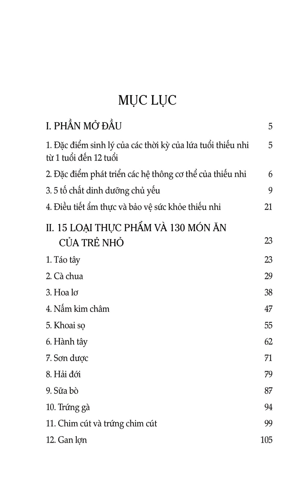 Sách trình bày đặc điểm sinh lý của các thời kỳ của lứa tuổi thiếu nhi từ 1 tuổi đến 12 tuổi, đặc điểm phát triển các hệ thống của thiếu nhi, 5 tố chất dinh dưỡng chủ yếu, điều tiết ẩm thực và bảo vệ sức khỏe thiếu nhi; giới thiệu 15 loại thực phẩm và 130 món ăn dành cho trẻ nhỏ; các phương thức chăm sóc sức khỏe thiếu nhi,…