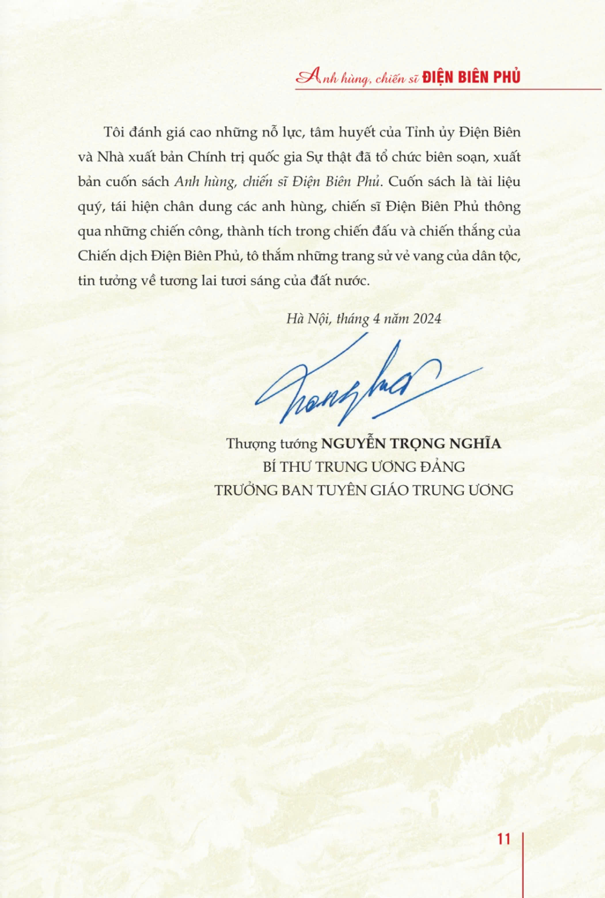 Kỷ niệm 70 năm chiến thắng lịch sử Điện Biên Phủ (07/5/1954 - 07/5/2024), Nhà xuất bản Chính trị quốc gia Sự thật phối hợp với Tỉnh ủy Điện Biên tổ chức biên soạn, xuất bản cuốn sách Anh hùng, chiến sĩ Điện Biên Phủ. Cuốn sách là ấn phẩm có ý nghĩa đặc biệt quan trọng, thể hiện tình cảm và sự tri ân sâu sắc của các thế hệ người dân Việt Nam đối với công lao của các anh hùng, liệt sĩ đã anh dũng hy sinh xương máu và tuổi thanh xuân cho chiến thắng vĩ đại này.