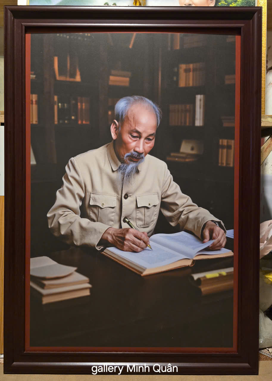 Kích thước 70*100cm Sản phẩm đã đóng khung hoàn thiện như mẫu. Ảnh in dầu bác Hồ viết Di chúc Ảnh bác Hồ ngồi ghế mây tại vườn hoa phủ Chủ tịch -ID212 Chất liệu