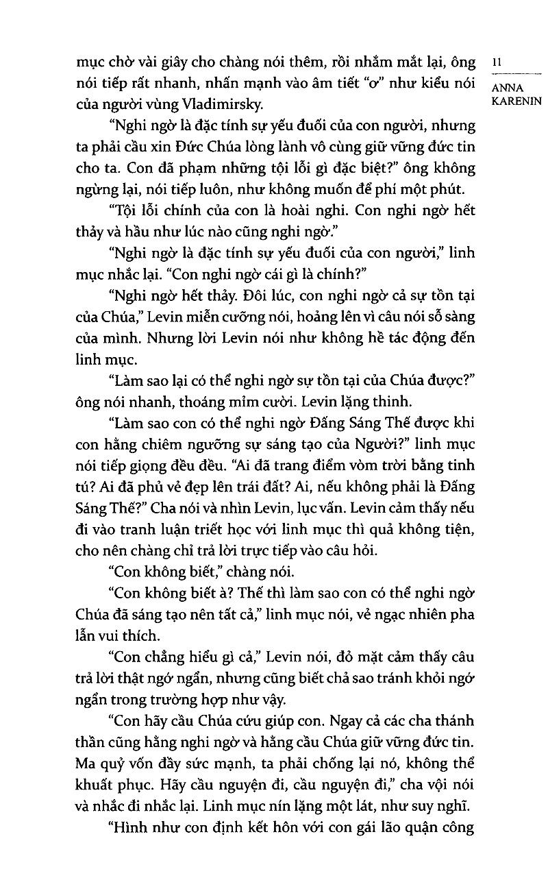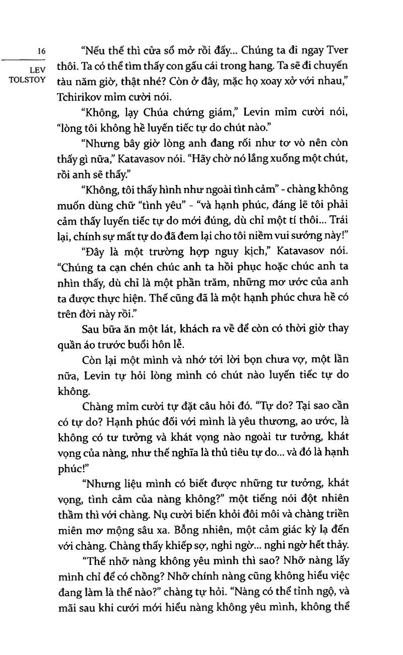 “Tất nhiên, bao giờ lão ta chả có lý, lão ta là người ngoan đạo, cao thượng mà! Thật là một con người đê tiện và bỉ ổi! Và điều đó, ngoài m.ình ra, không ai hiểu và sau này cũng sẽ không ai hiểu mà chính m.ình lại không thể nói ra được. Họ bảo lão ấy là người thông minh, mộ đạo, đức hạnh, hiền lương; nhưng họ không nhìn thấy điều m.ình đã thấy. Họ không biết là ròng rã tám năm nay, lão ấy đã áp bức, bóp nghẹt tất cả những gì sống thực trong m.ình, không bao giờ lão ấy nghĩ m.ình là một người đàn bà đang sống, m.ình cần có tình yêu. Họ không biết trong mỗi bước đi, lão đều làm m.ình khổ nhục và lão mãn nguyện về việc đó. Mình đã chẳng hết sức cố bào chữa cho thái độ cư xử của lão đó sao? Mình đã chẳng cố yêu lão, yêu con m.ình trong khi m.ình không thể yêu chồng được nữa đó sao? Nhưng đã đến lúc m.ình hiểu rằng không thể tự lừa m.ình được nữa, rằng sống không phải là tội ác, rằng Chúa đã tạo ra m.ình là người như vậy, m.ình cần sống và yê