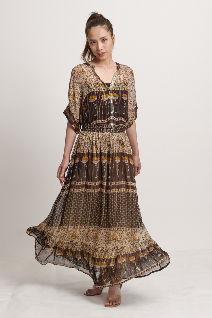 Áo cotton cao cấp, nền vải ánh kim nhẹ, màu ombre độc đáo. Phom suông, có thể mặc thành đầm dấu quần phối với quần short, hoặc mặc với quần jeans, quần legging. Dài 78cm.