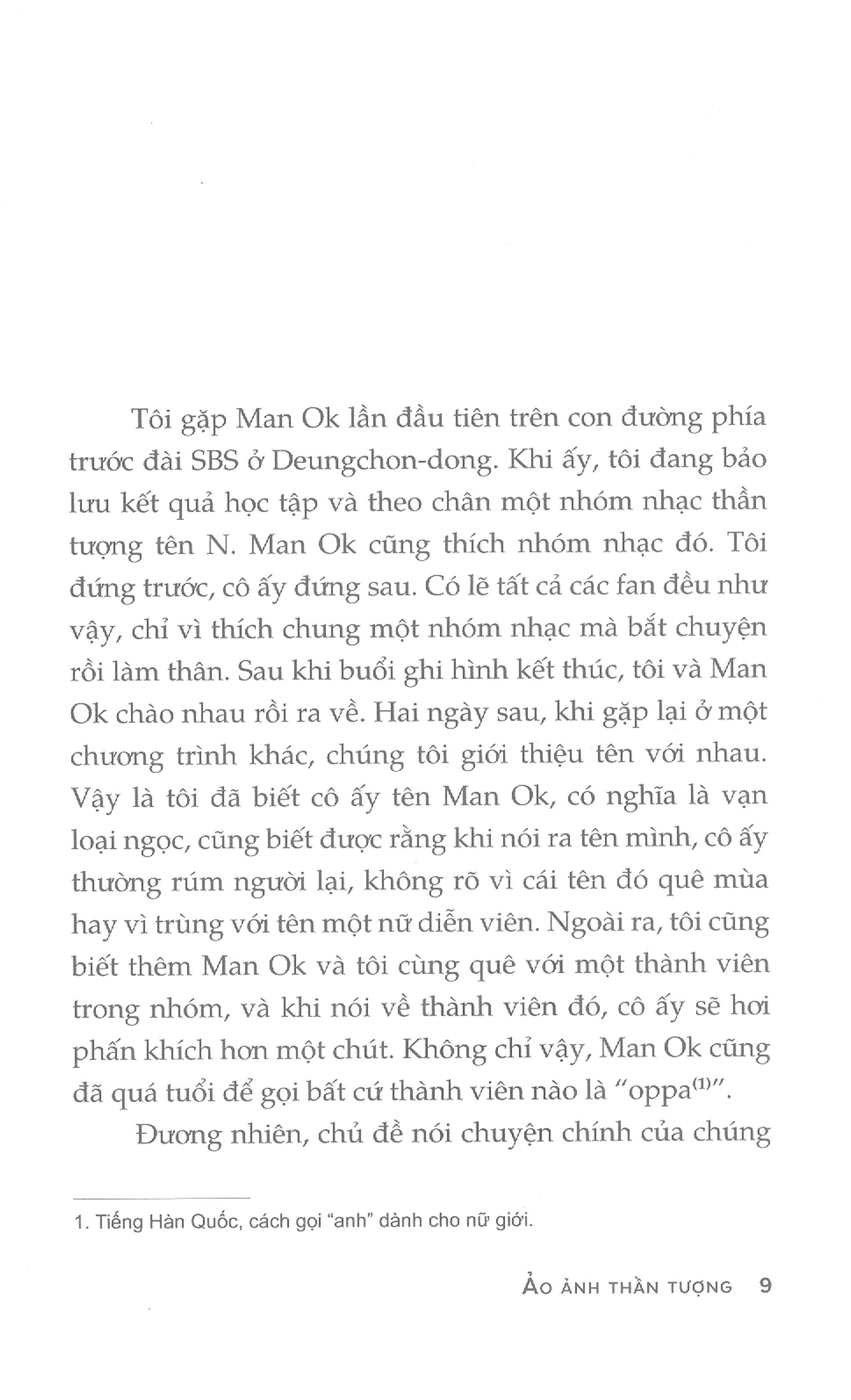 Ảo Ảnh Thần Tượng Trước đây tớ không hiểu nổi đám đông người hâm mộ được quay lên ti vi, hoặc là tớ đã được dạy để không thể hiểu được họ. Họ hướng về phía những ca sĩ đang đứng trên sân khấu, gào thét, khóc lóc vật vã đến mức người ta muốn đặt câu hỏi, rốt cuộc là thứ cảm xúc mãnh liệt gì đã khiến họ như vậy. Bất cứ khi nào nhìn thấy các fan cuồng cư xử như thể nếu cần sẽ sẵn sàng rút ruột rút gan ra dâng hiến, bố tớ luôn tặc lưỡi bảo tớ đừng bao giờ làm như họ. Tớ lúc nào cũng đáp lại “vâng, thưa bố”. Nhưng tớ đáp vậy không phải để làm vừa lòng bố, mà quả thực khi ấy, tớ chỉ hiểu và nhìn thế giới như những gì bố tớ nhìn và hiểu mà thôi. Lúc ấy, tớ không thể hiểu được tại sao nhất định phải đi xa như vậy và gào thét như thế, trong khi chỉ cần bật ti vi lên là có thể nhìn được thần tượng gần thế này rồi. Vậy, thế giới mà cô gái này đã tự mình nhìn và hiểu sau khi quên lời bố trở thành một fangirl, theo chân nhóm nhạc yêu thích tới mọi buổi ghi hình và sự kiện, là một thế giới như thế nào? Ảo ảnh thần tượng, với những đúc kết “trúng tim đen fangirl” vừa thực tế, sâu cay lại vừa hài hước cùng những cảm xúc nồng nhiệt không màng che đậy không ngại bóc trần, chính là lời hồi đáp đầy ấn tượng cho câu hỏi ấy.