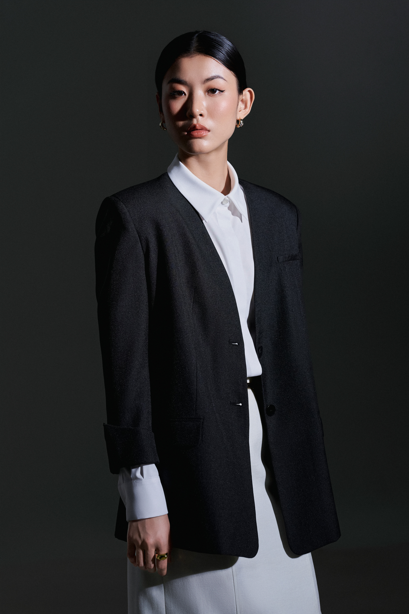1. Thông tin sản phẩm Áo blazer vai rộng, không cổ, cài 2 khuy, tay lỡ dài, có lơ vê. Mỗi lớp vải mềm mại của Vincent Set là sự kết hợp hoàn hảo giữa