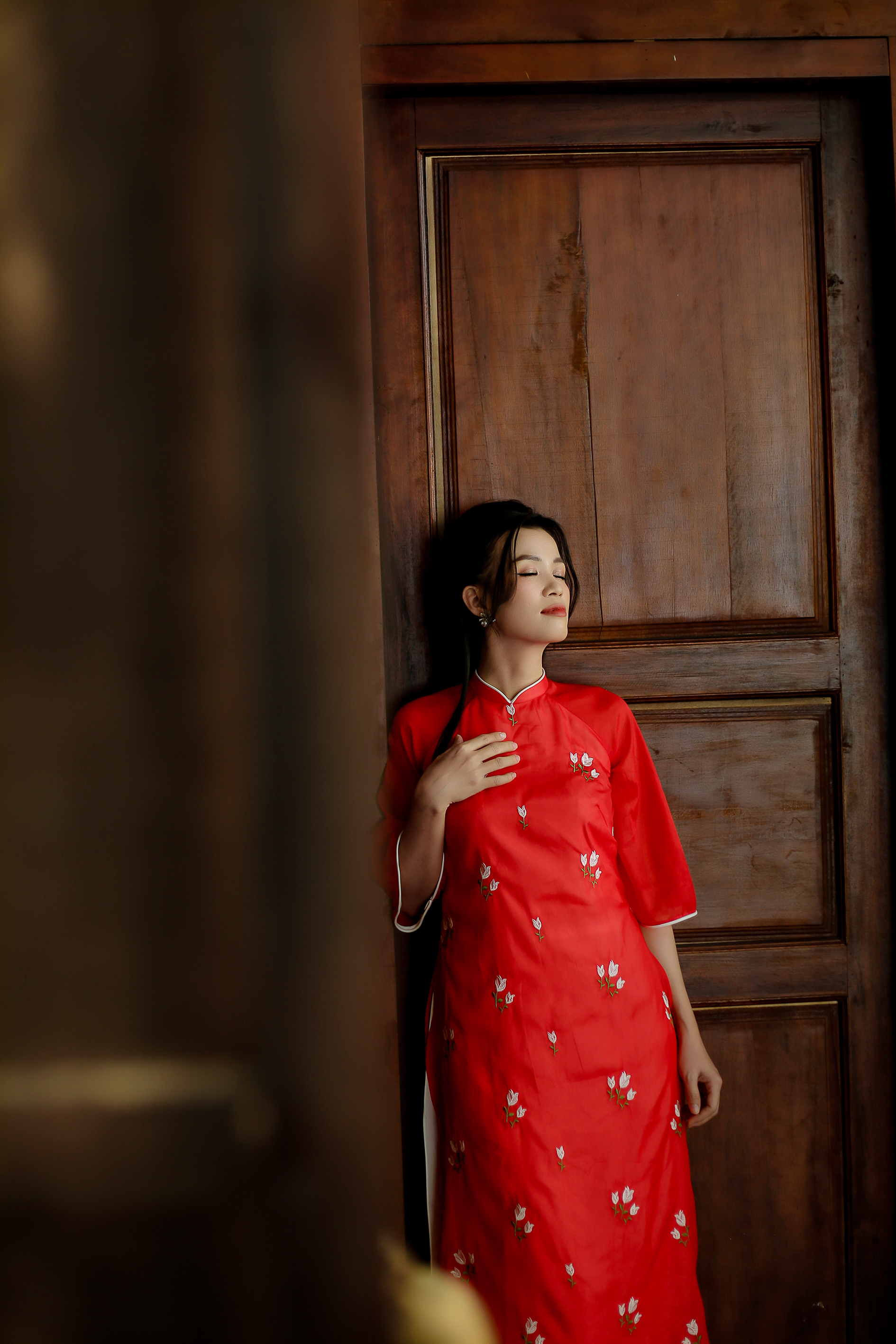 áo dài đỏ form suong may chất liệu lụa gấm kết hoa sen, tay lỡ loe, quần lụa trắng
