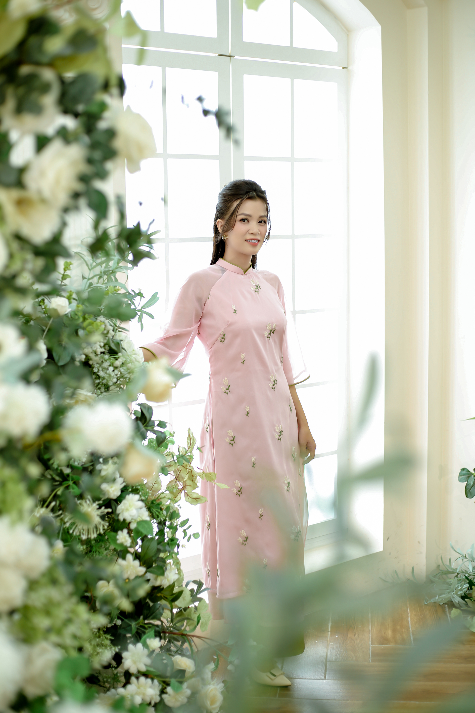 Áo dài cách tân thiết kế 4 tà may vải tơ màu hồng nhạt thêu hoa lá, lót lụa bên trong, tay lỡ loe viền màu xanh bơ, quần lụa xanh bơ