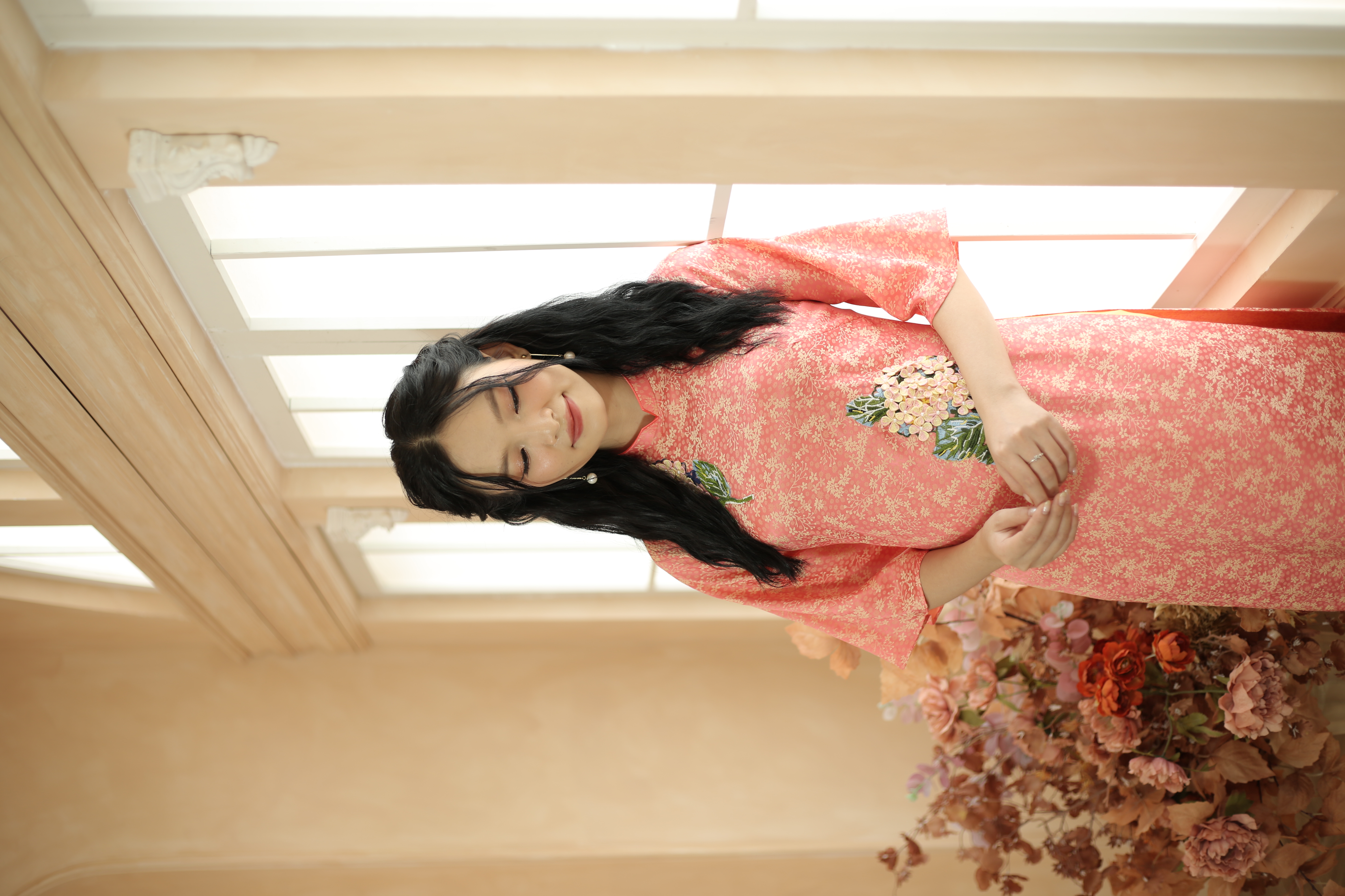 áo dài cách tân form suông được may bằng chất liệu lụa gấm loại 1 màu cam nhẹ nhàng, kết hoa thủ công, tay lỡ loe